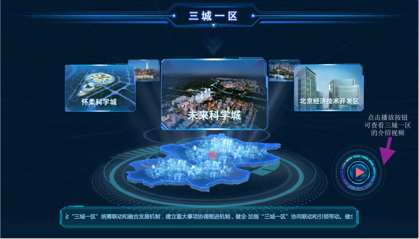 头部的规划展示区,以充满科技感和未来感的北京城区地图为基底,一束通透轻盈的光锥投亮上方的浮动屏。5个城区浮动屏走马灯似轮换,随意点击一块大屏,即会弹出分城区缩略大屏,含分城区的介绍和建设目标等信息。