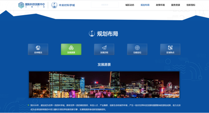 从功能上看,三城一区主页涵盖规划展示、动态资讯、政策公告、转化入驻、视频图片等七大功能区,放眼望去,三城一区的整体风貌尽收眼底。