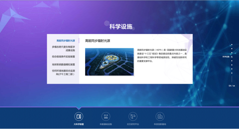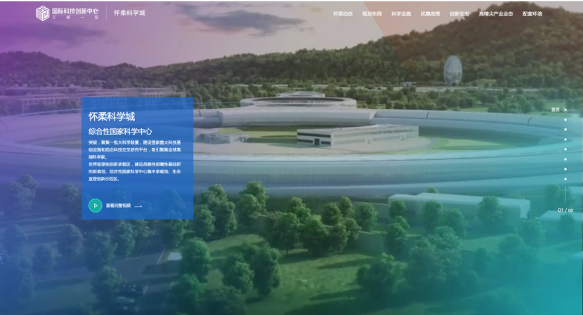 坐拥多个 “国之重器”怀柔科学城主页采用分屏设计,首屏的视觉展示以虚拟画面勾勒出壮阔的效果图。如果游客感到惊鸿一瞥,意犹未尽,不妨移步下方的“科学设施”栏目,对怀柔科学城现有的科学设施进行详细了解。