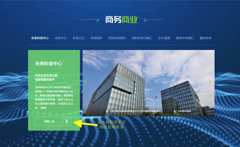 商务商业栏目提供空间入驻服务。通过查看空间展示内容,游客可以依据页面上提供的信息联系到未来科学城服务团队,享受贴心的入驻服务。