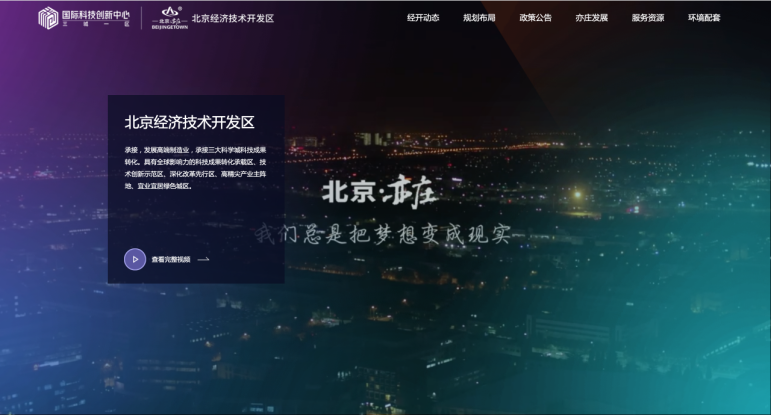 创新型产业集群示范区之一的北京经济技术开发区,首屏视觉呈现中的万家灯火,点亮梦想,照见北京经济发展的新增长极。