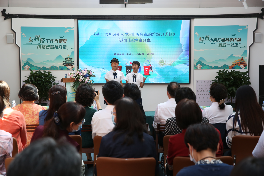 活动后,少年科学爱好者双胞胎初斯羽、初斯奇结合作品《能听会说的垃圾分类箱》分享了她们的发明小故事。