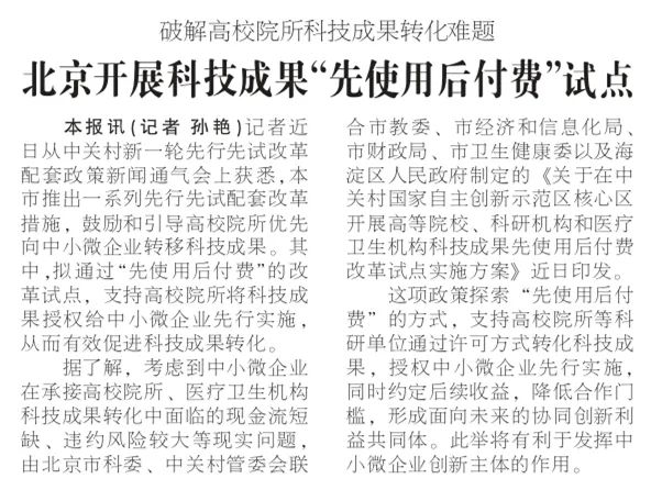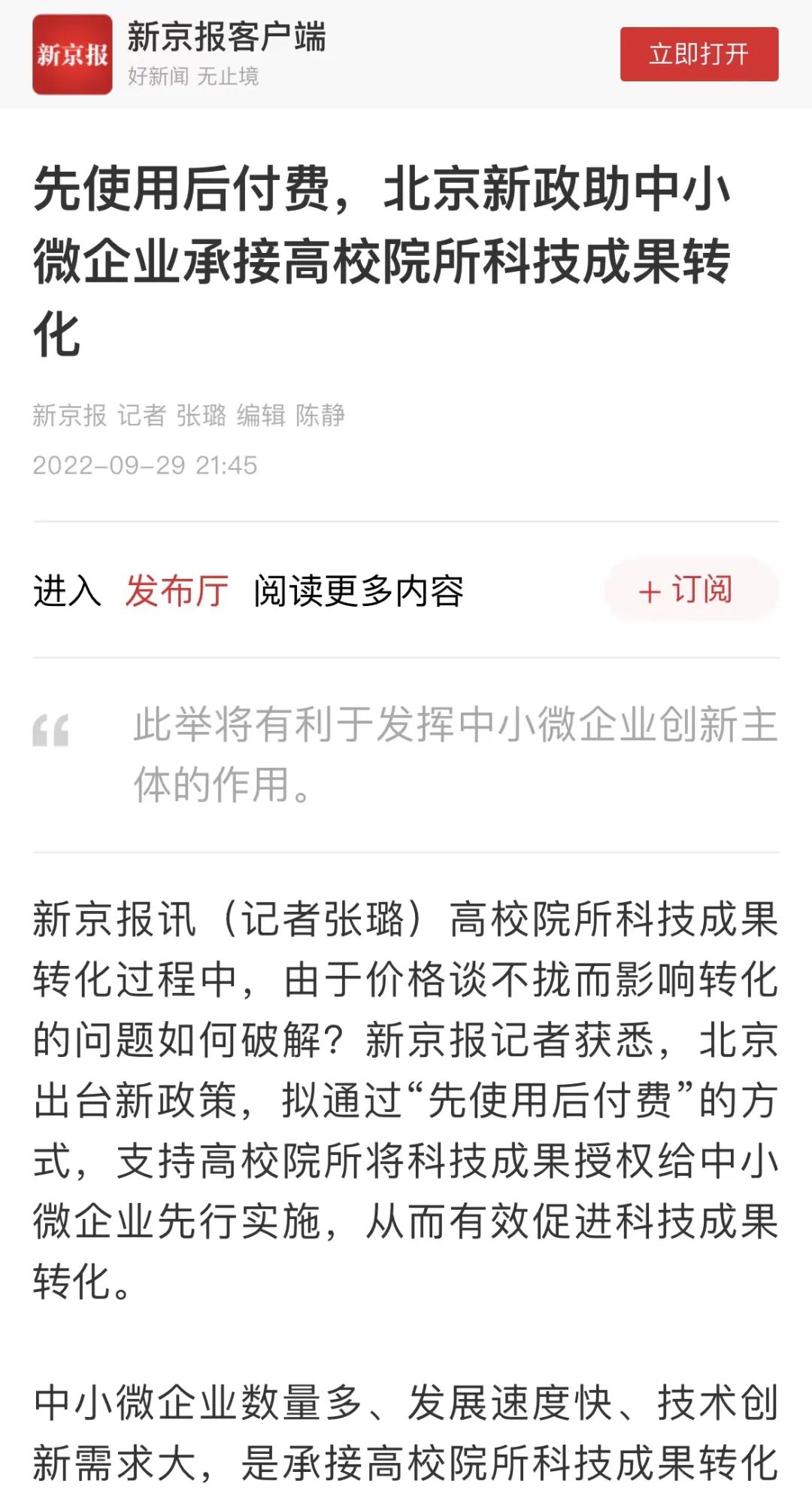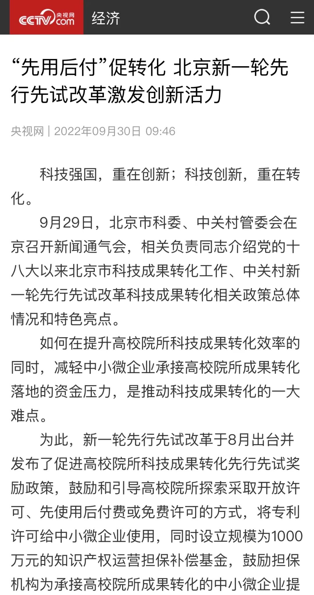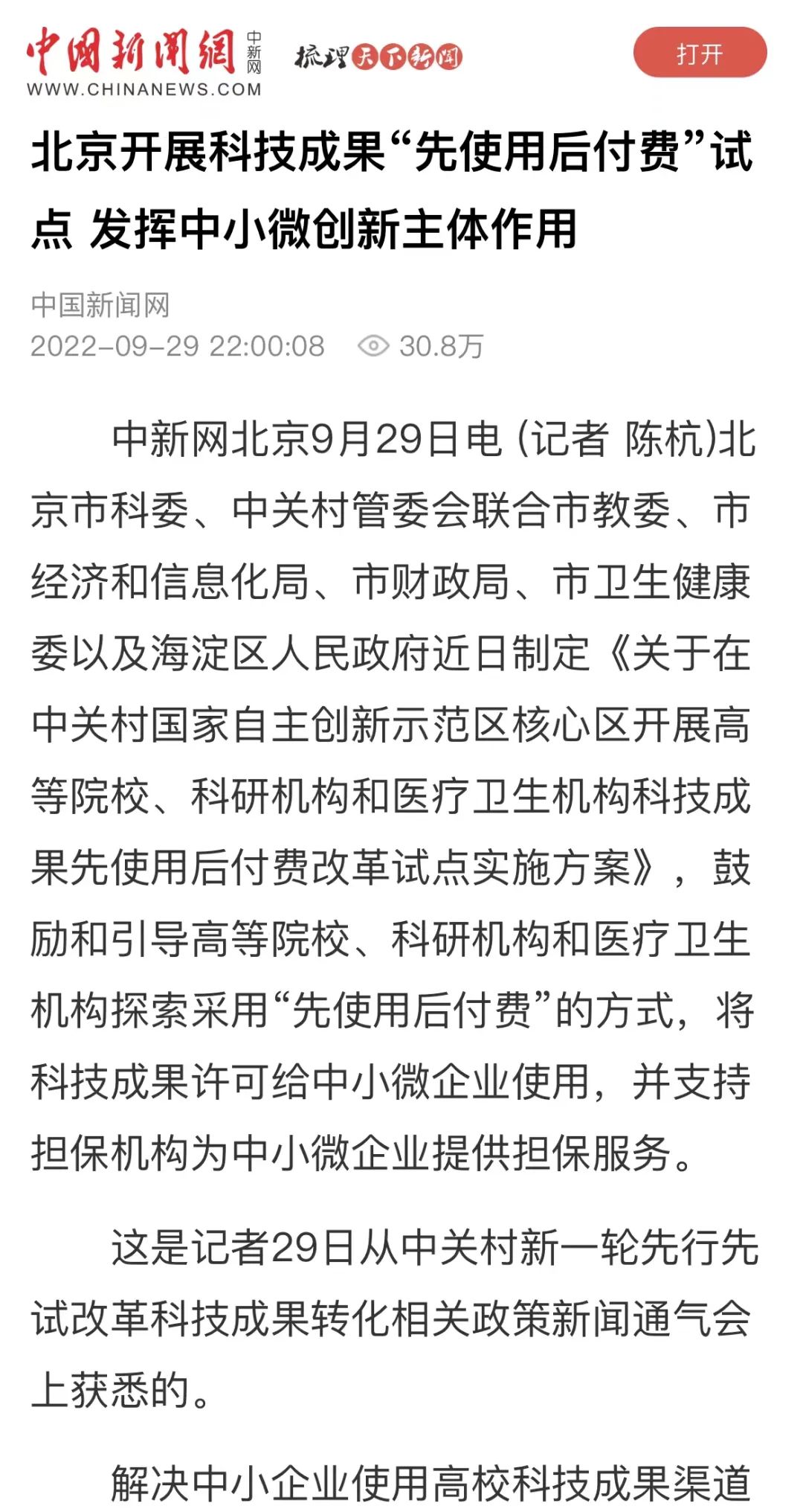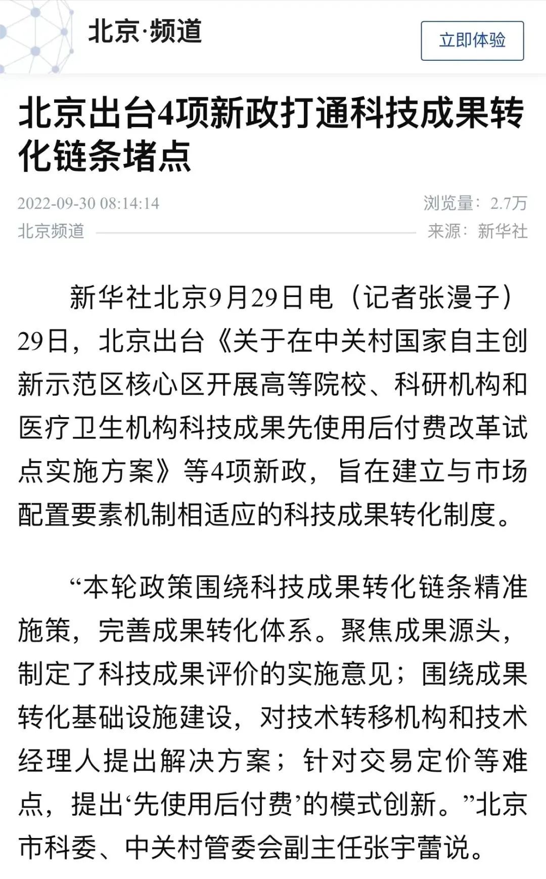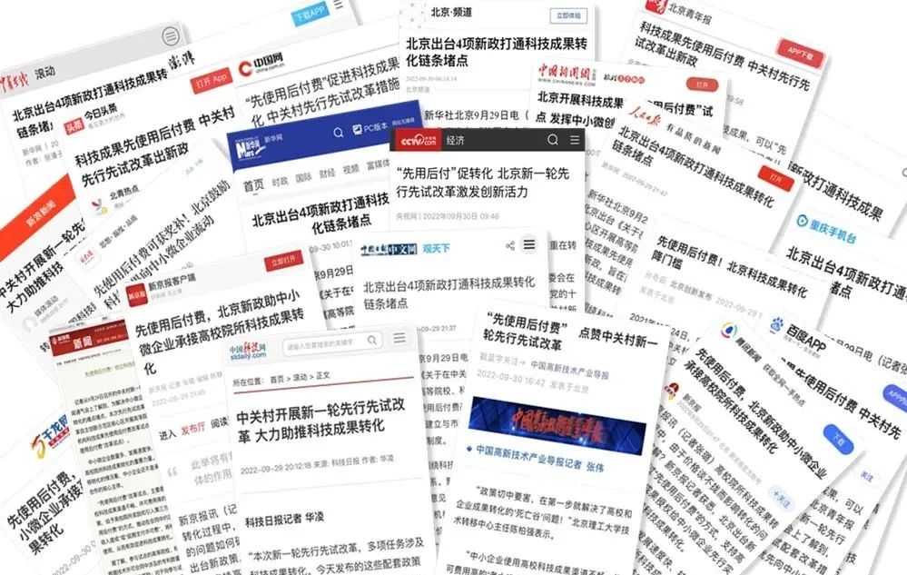 9月29日,北京市科委、中关村管委会召开中关村新一轮先行先试改革配套政策新闻通气会,介绍了涉及科技成果转化的4项配套政策。其中,探索科技成果“先使用后付费”改革试点这一突破性政策引发媒体高度关注。新华社、劳动午报等主流媒体及人民日报客户端、北京日报客户端、央视网、澎湃、新浪、今日头条等新媒体纷纷报道。一起来看看吧。
