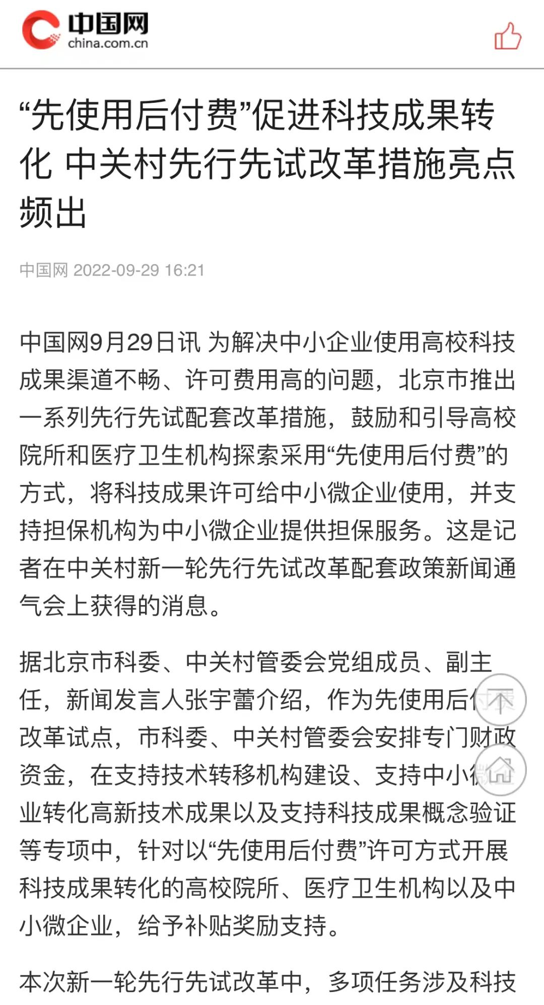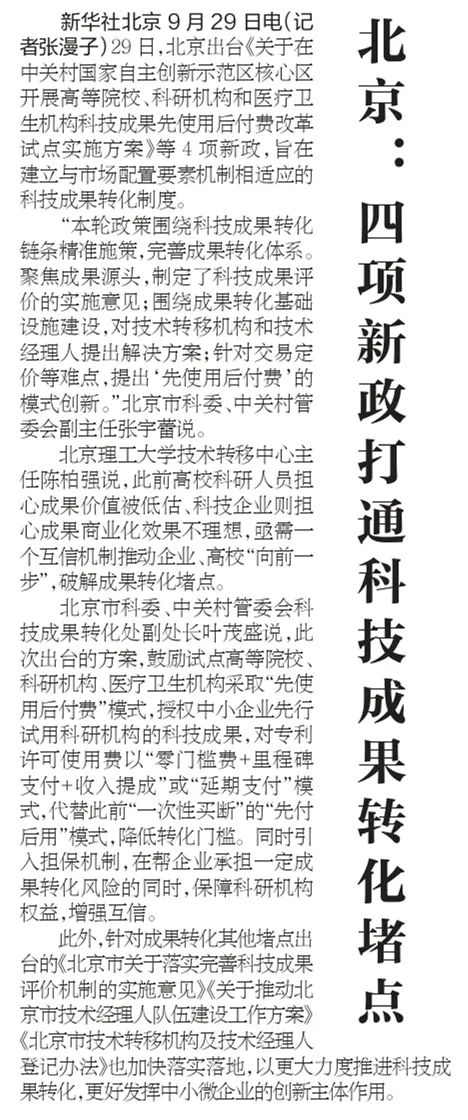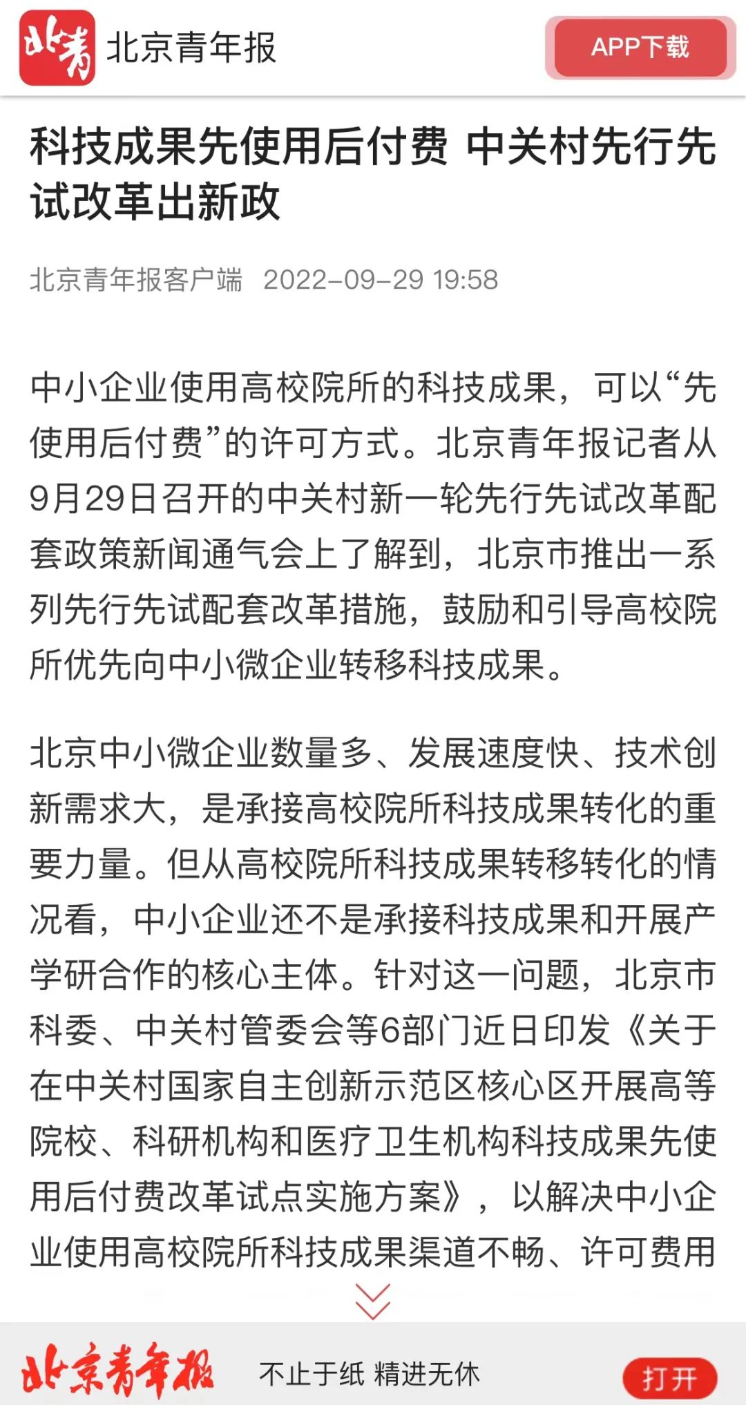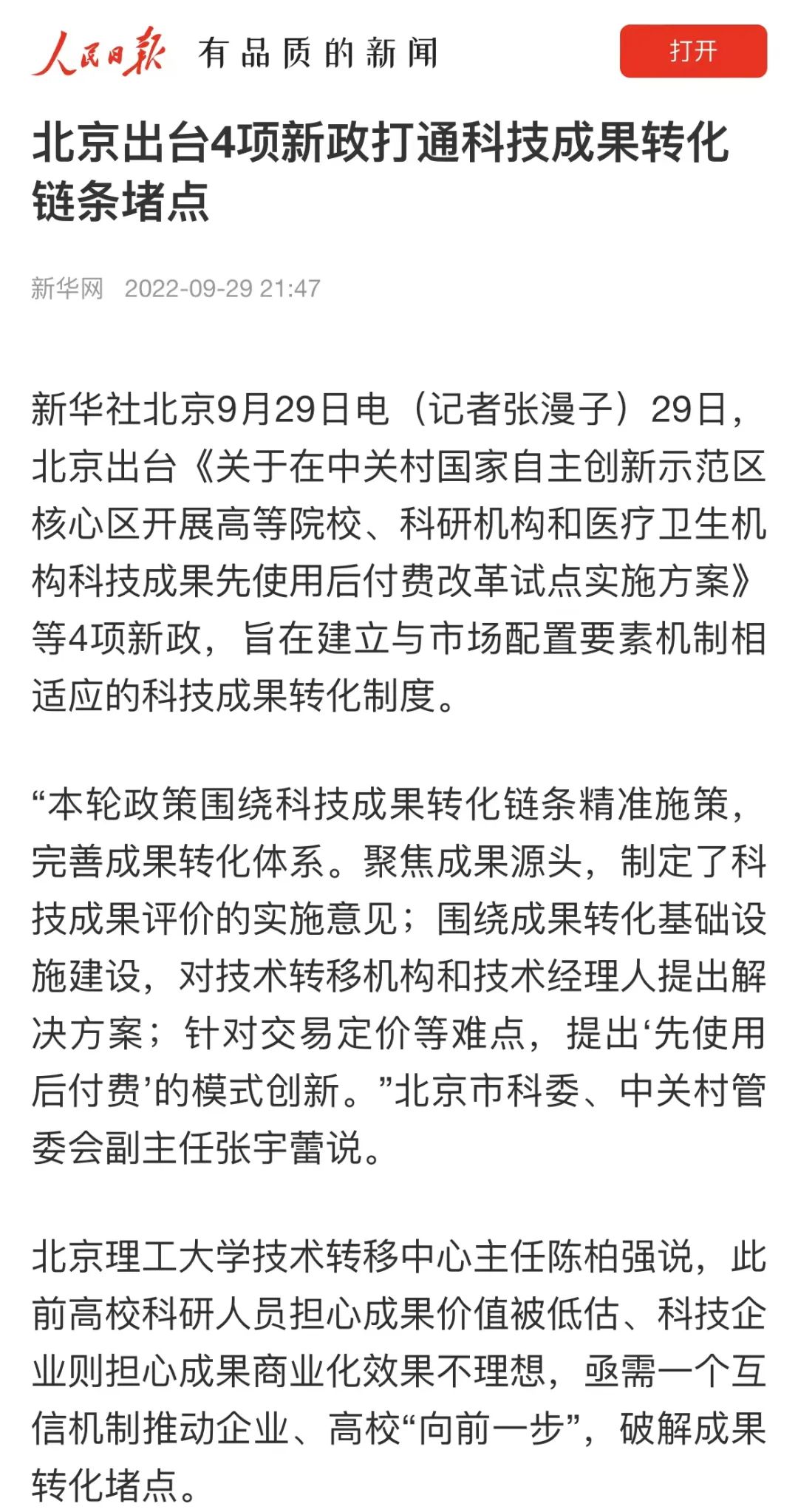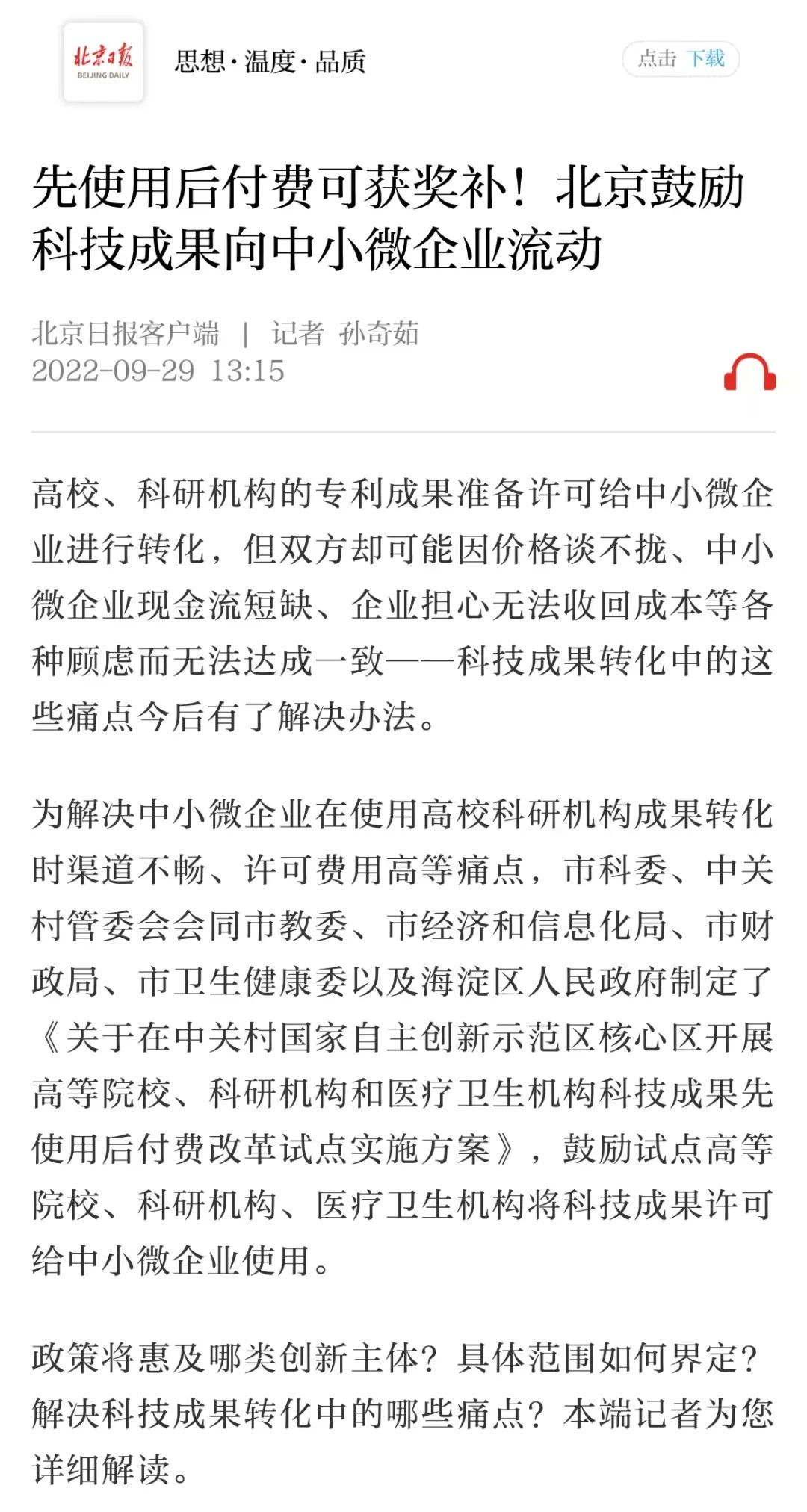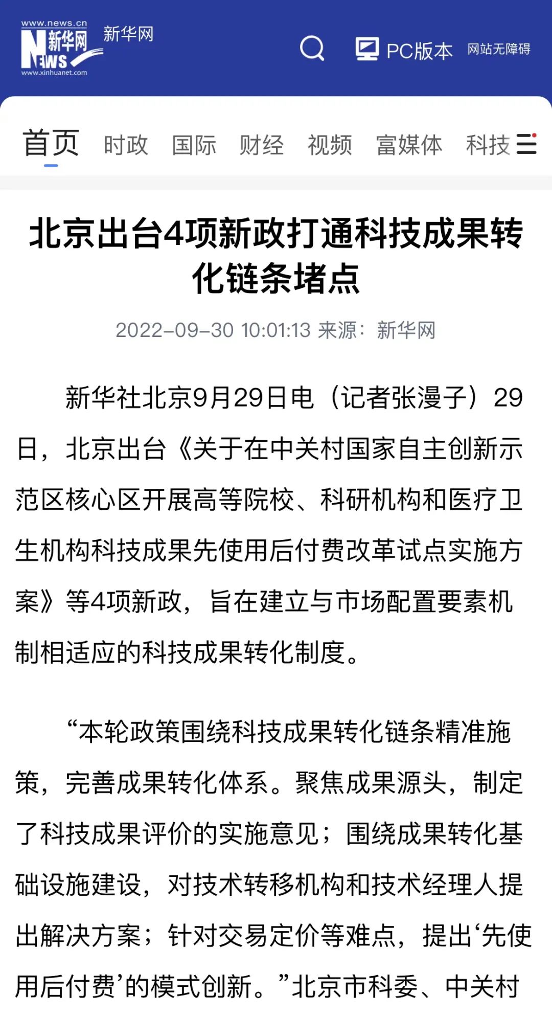 9月29日,北京市科委、中关村管委会召开中关村新一轮先行先试改革配套政策新闻通气会,介绍了涉及科技成果转化的4项配套政策。其中,探索科技成果“先使用后付费”改革试点这一突破性政策引发媒体高度关注。新华社、劳动午报等主流媒体及人民日报客户端、北京日报客户端、央视网、澎湃、新浪、今日头条等新媒体纷纷报道。一起来看看吧。
