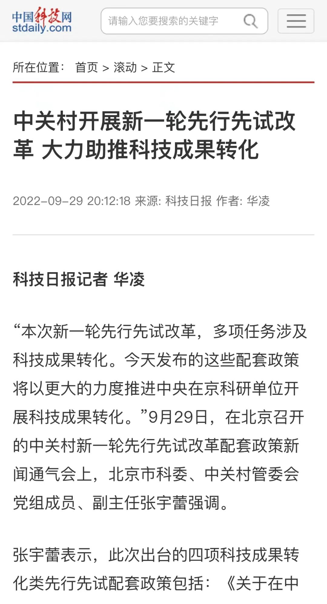 围绕科技成果转化链条精准施策,完善成果转化体系,聚焦成果源头,制定了科技成果评价的实施意见;围绕成果转化基础设施建设,对技术转移机构和技术经理人提出解决方案,针对交易定价等难点提出“先使用后付费”的模式创新……跨越转化“死亡谷”中关村新一轮先行先试改革掷地有声。