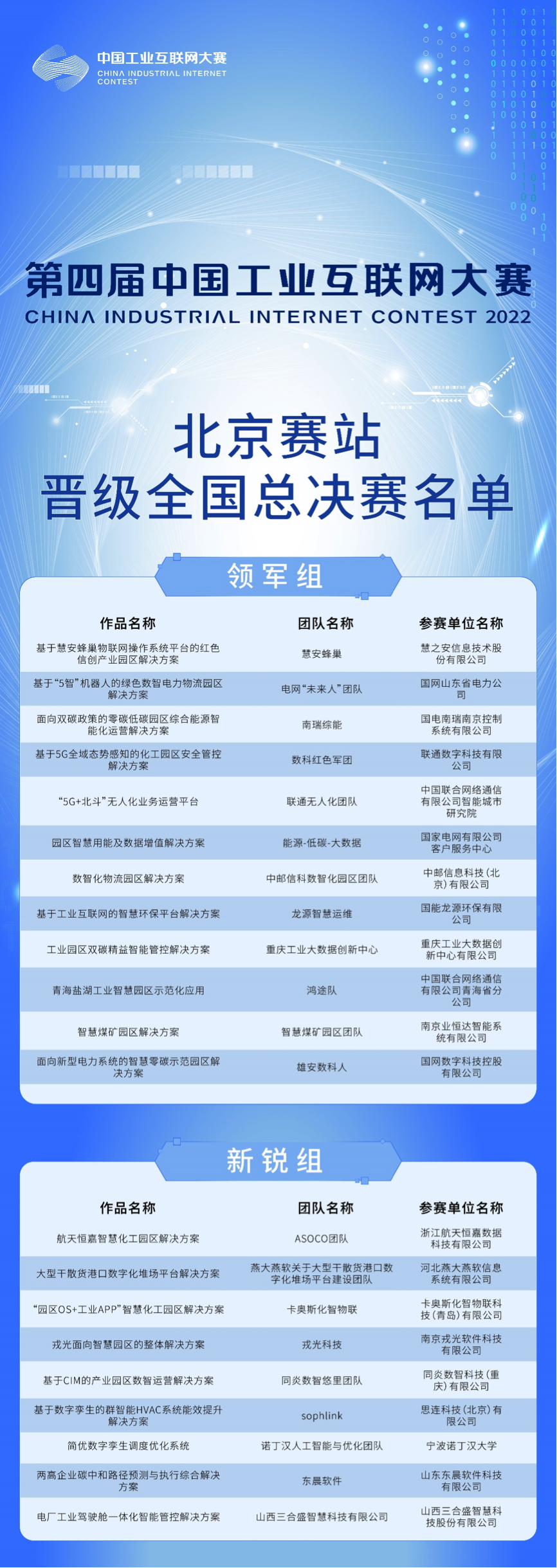 第四届中国工业互联网大赛北京赛站决赛近日在石景山区中关村工业互联网产业园举行,基于慧安蜂巢物联网操作系统平台的红色信创产业园区解决方案、“5G+北斗”无人化业务运营平台、基于“5智”机器人的绿色数智电力物流园区解决方案等项目从数百个项目中胜出,进入全国总决赛。