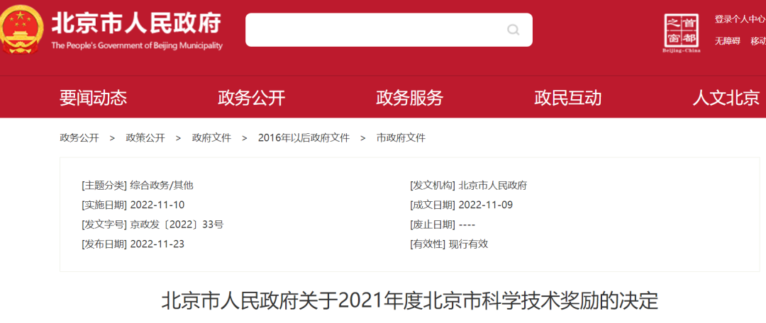 北京市人民政府关于2021年度北京市科学技术奖励的决定