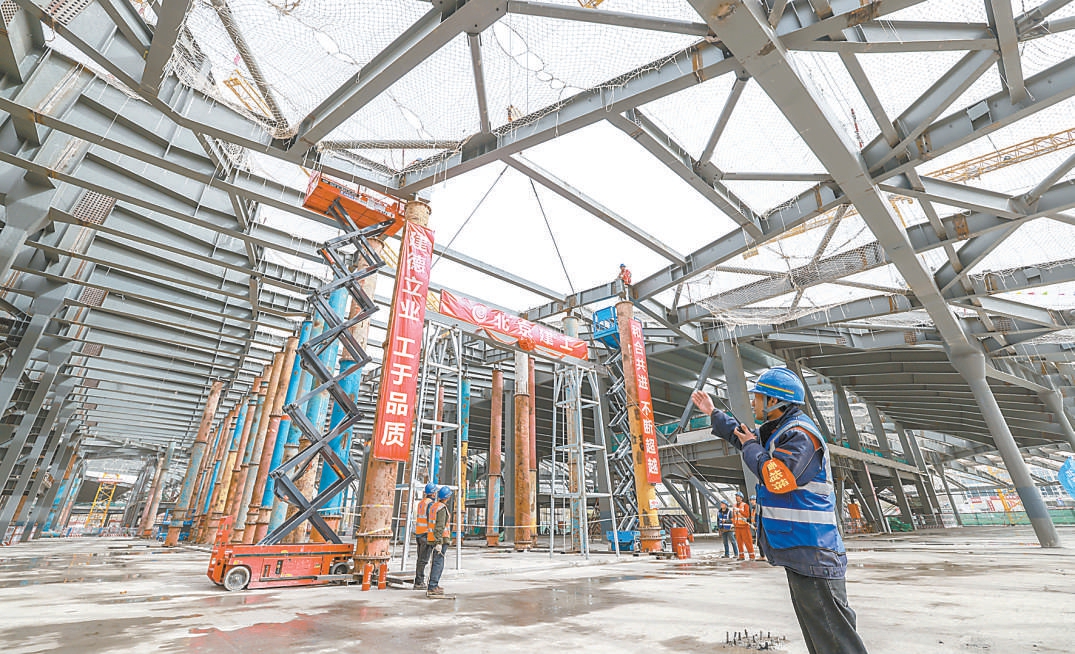 3月22日,随着最后一根结构钢梁被缓缓吊起并安装就位,中关村论坛永久会址钢结构全部封顶。(北京日报记者 潘之望摄)