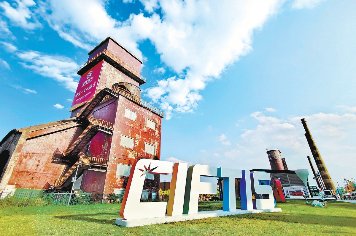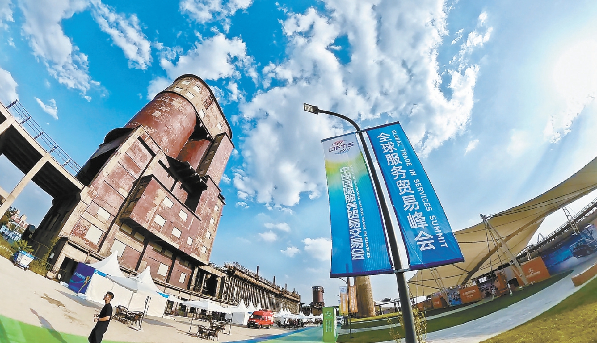蓝天白云下,工业遗址耸立,服贸会标志十分醒目