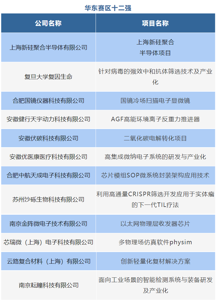 经过激烈角逐,苏州沙砾生物科技有限公司、芯瑞微(上海)电子科技有限公司、南京金阵微电子技术有限公司、安徽健行天宇动力科技有限公司等12家硬科技企业脱颖而出,成功入围本届大赛华东赛区十二强。