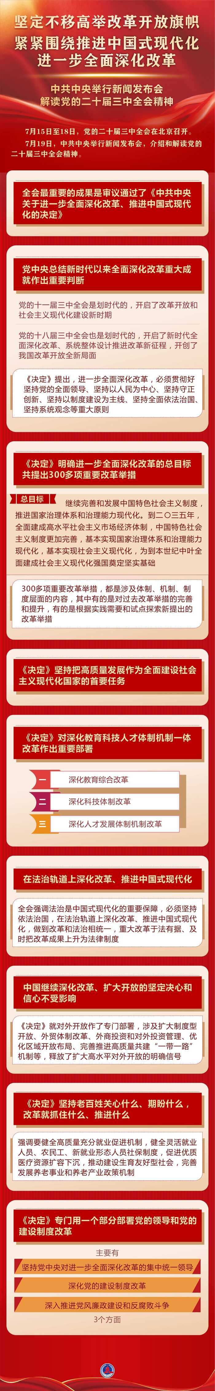 7月15日至18日,党的二十届三中全会在北京召开。此次全会是在新时代新征程上,中国共产党坚定不移高举改革开放旗帜、紧紧围绕推进中国式现代化进一步全面深化改革召开的一次十分重要的会议。
