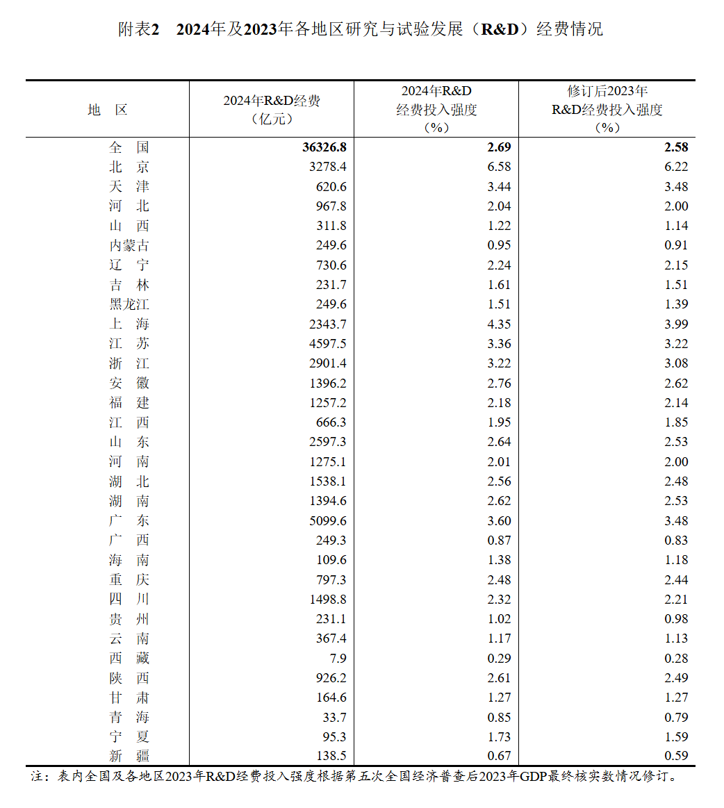 今天,国家统计局、科学技术部、财政部发布《2024年全国科技经费投入统计公报》,公报显示:2024年全国研究与试验发展(R&D)经费投入达3.6万亿元以上,比上年增加2969.7亿元,增长8.9%;R&D经费投入强度(与国内生产总值之比)为2.69%,比上年提高0.11个百分点。分地区看,北京作为直辖市,2024年R&D经费投入达3278.4亿元,在广东省和江苏省之后,位居全国第三;R&D经费投入强度为6.58%,稳居全国第一。