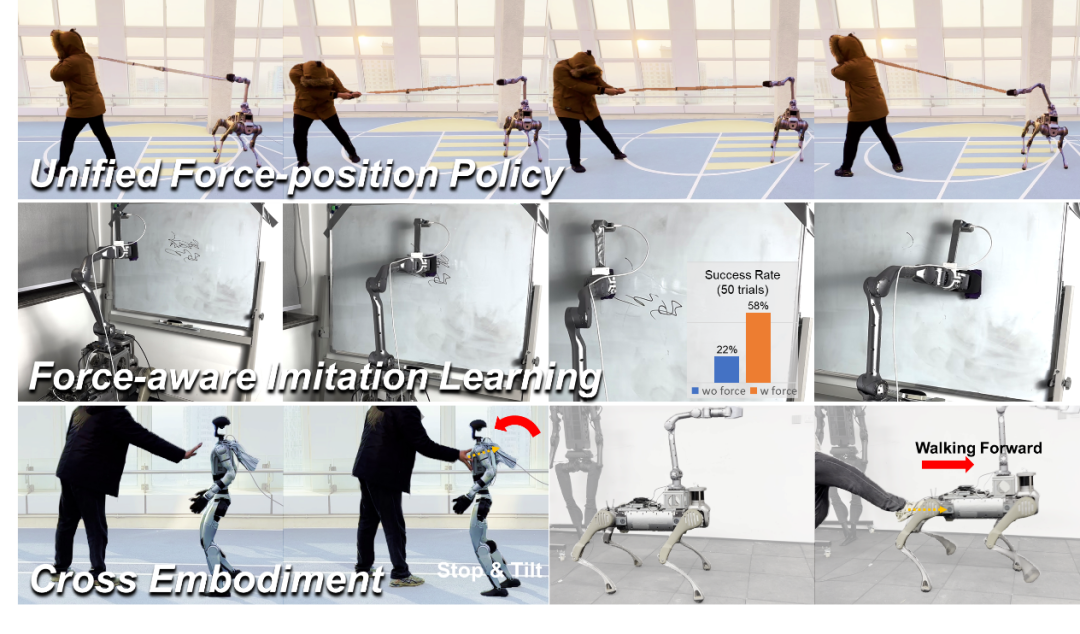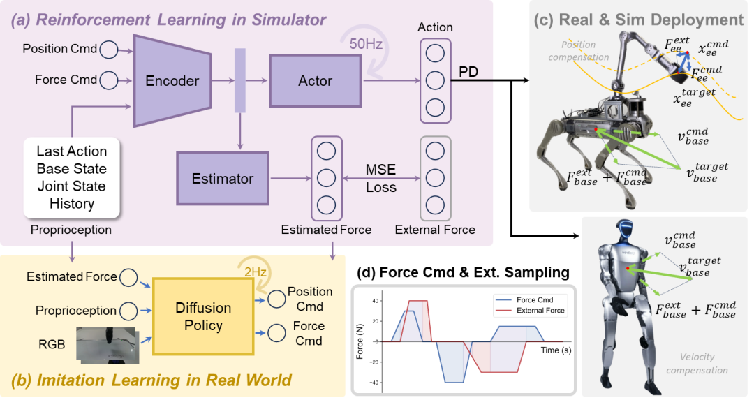 机器人需要的不仅是“走到哪里”“手伸到哪里”,还需要理解“该用多大的力”。然而,力传感器在机器人上往往昂贵、笨重或者根本不可用。现有的方法通常要么只考虑位置,要么只考虑力,尤其是对于足式操作机器人来说,还没有工作对两者同时进行建模。于是出现了一个巨大的研究空白:能否让机器人在没有额外力传感器的情况下,学会同时控制力与位置?