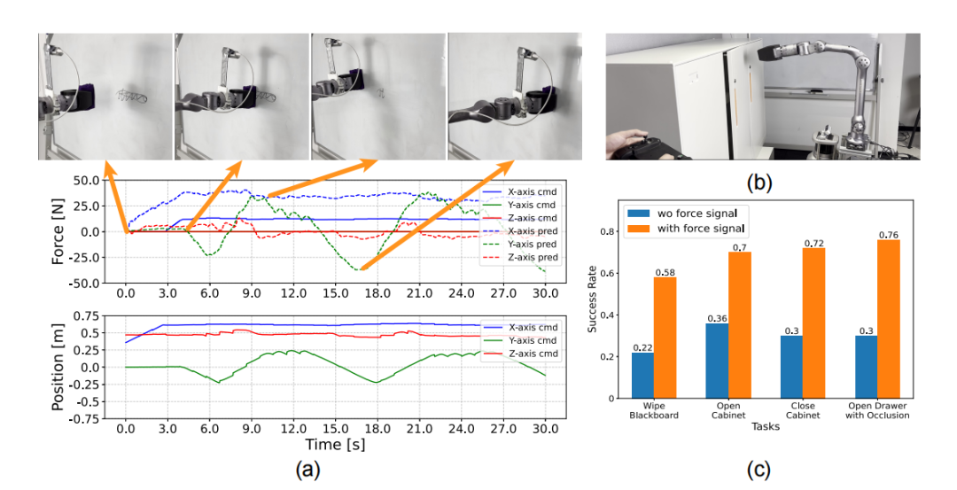 图 3:力感知模仿学习。(a)在擦黑板任务中,经训练的力感知模仿策略所输出的位置指令与力指令的时间序列。其中,“cmd” 代表模仿学习策略的输出,“pred” 代表低层级策略所估计的外力。(b)数据采集过程的可视化展示。(c)在四项任务的 50 次试验中,本文提出的策略与仅基于视觉的基准策略的性能对比。