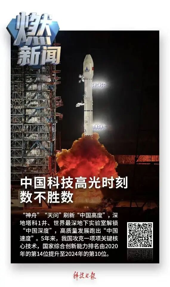 5年来,属于中国科技的高光时刻数不胜数:福建舰的电磁弹射划破碧波、C919的机翼掠过天际、“奋斗者”号在万米深海留下印记、麒麟芯片高端突围……我国科技事业取得历史性成就,国家综合创新能力排名由2020年的第14位提升至2024年的第10位。