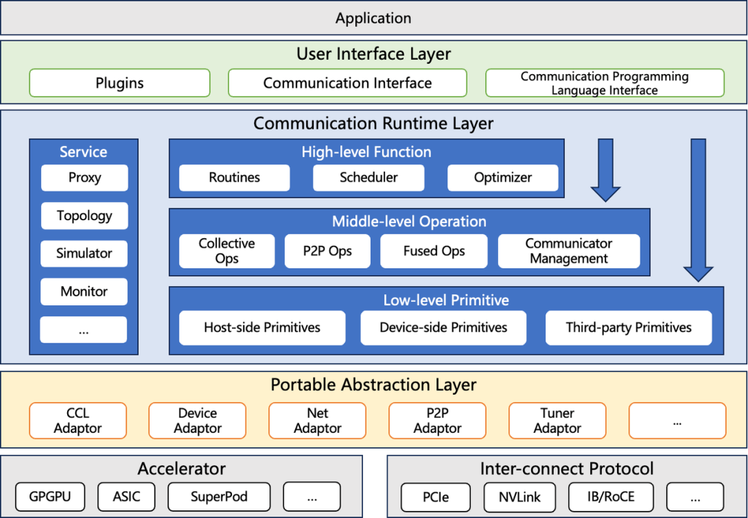 通过创新分层架构设计,既能向上提供标准化的通信接口,便于各类AI应用的统一接入,又能向下通过可迁移抽象层开放适配机制,使芯片厂商能够轻松集成自研通信库或底层运行时,增强了系统的跨平台兼容性与可扩展性。