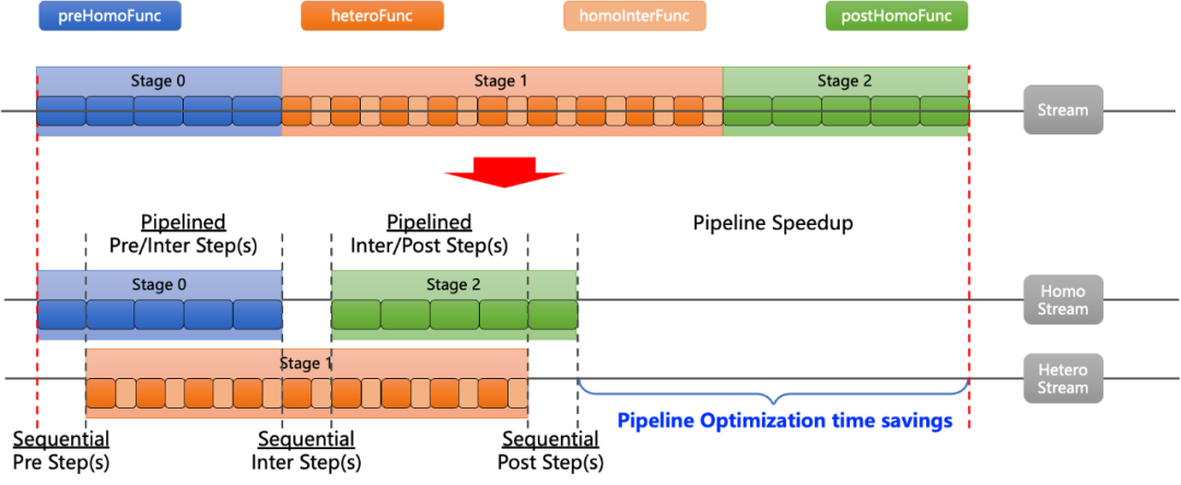 通过引入流水线并行来实现Pre、Inter、Post三个阶段任务的重叠,核心优化可以概括为两点:1)传输数据多Chunk切分,从而实现细粒度流水;2)多Stream并行,从而实现Pre/Post和Inter阶段的重叠。