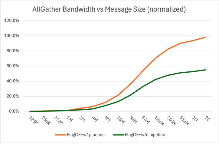 我们通过实测ChipA 2机16卡对比了AllGather和AllReduce通信操作的已有的C2C算法和流水线并行优化后的C2C算法的性能数据(128K - 2G)。如下图所示:1)C2C AllGather算法使用流水线并行后相比之前算法带宽平均提升1.7x,最大提升2.0x;2)C2C AllReduce算法使用流水线并行后相比之前算法带宽在大通信量上(>=128M)平均提升1.3x,最大提升1.3x。