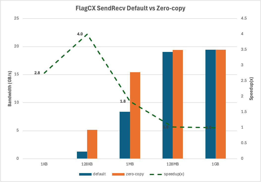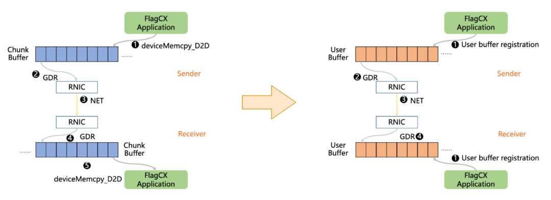如下图左所示,原生Device-buffer RDMA技术会在初始化阶段预先分配和注册一段可以允许从网卡直接拉取数据的Device-buffer(默认值64MB)。在实际通信过程中,FlagCX运行时会调用D2D拷贝实现应用程序的User-buffer和预注册Devic-buffer的数据传输。这会造成额外的数据拷贝开销,并严重影响小通信量场景P2P通信性能。为此,FlagCX将Device-buffer RDMA技术进行了zero-copy支持,如下图右所示,在初始化阶段通过直接注册User-buffer,避免实际通信过程中的D2D拷贝调用,从而允许网卡直接在User-buffer上进行数据读取和写入操作。