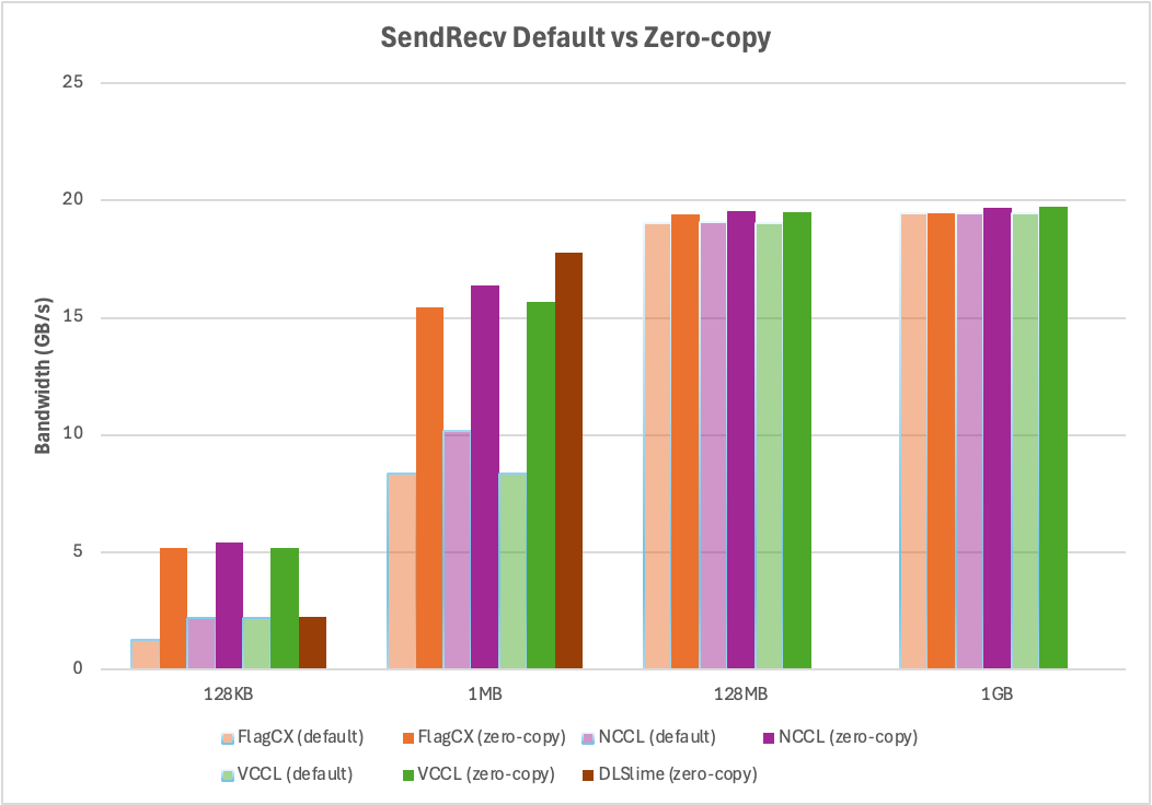 同时,与业界其他通信库(如NCCL、VCCL、DLSlime等)对比表明FlagCX的零拷贝Device-buffer RDMA性能已达到业界领先水平(下图中DLSlime的128MB和1GB性能数据在我们的测试环境中未能成功运行,因此未包含其对比结果)。