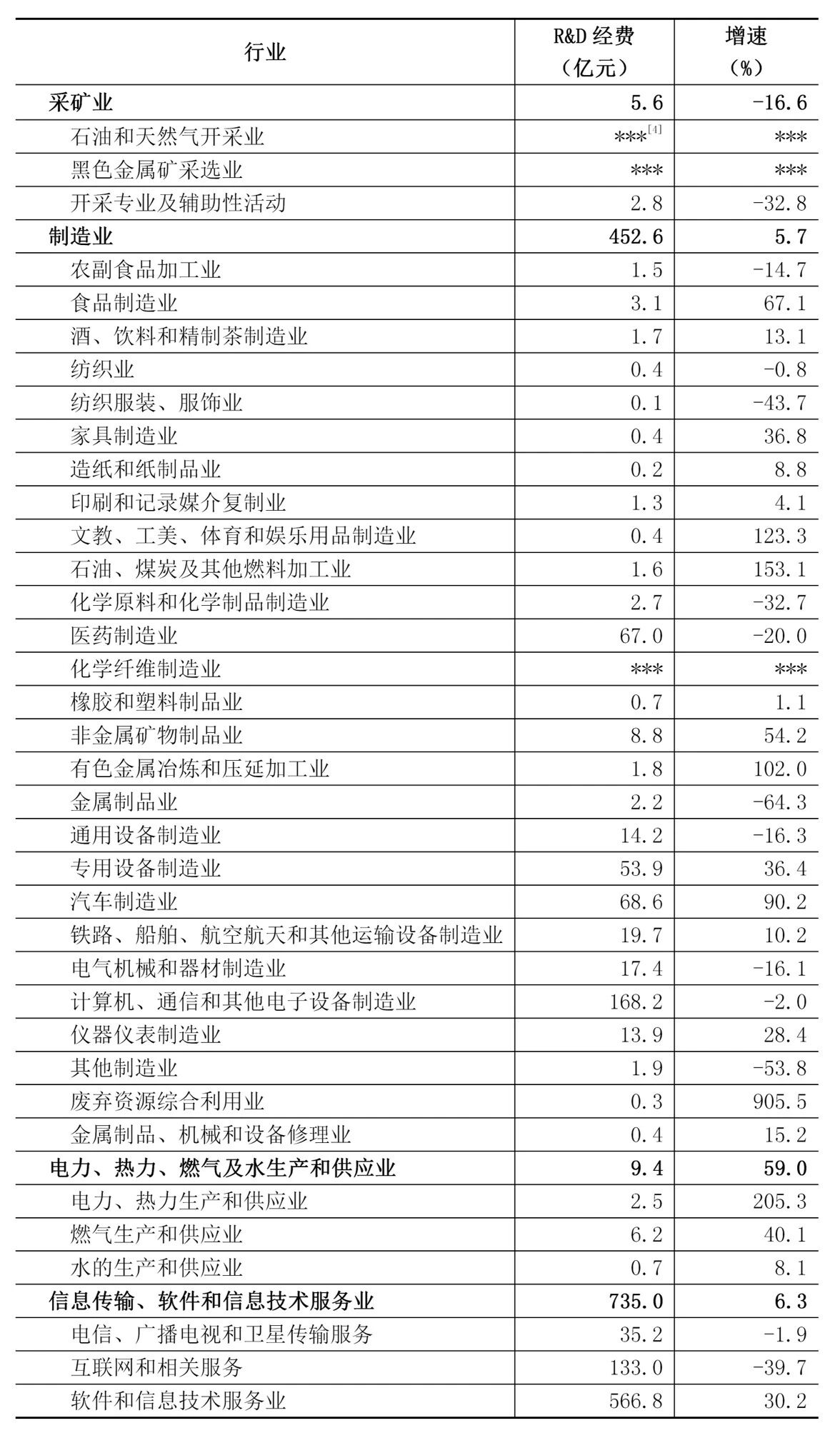 分行业看,规模以上信息传输、软件和信息技术服务业研究与试验发展(R&D)经费735.0亿元,比上年增长6.3%,其中,软件和信息技术服务业研究与试验发展(R&D)经费566.8亿元,增长30.2%;规模以上工业企业研究与试验发展(R&D)经费467.7亿元,增长6.1%,其中,高技术制造业研究与试验发展(R&D)经费297.3亿元。规模以上工业企业中,研究与试验发展(R&D)经费投入超过十亿元的行业大类有8个,与上年保持一致,这8个行业经费占全部规模以上工业企业研究与试验发展(R&D)经费的比重为90.4%(详见附表)。