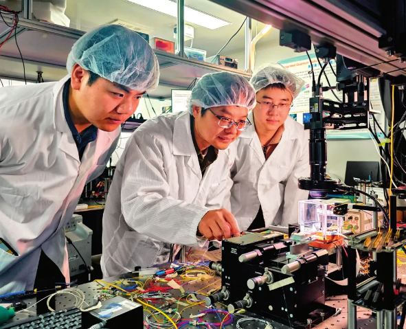北京大学王剑威教授(中)与博士生贾新宇(左)和翟翀昊(右)在北大实验室测试集成光量子芯片(2025年2月18日摄)受访者供图