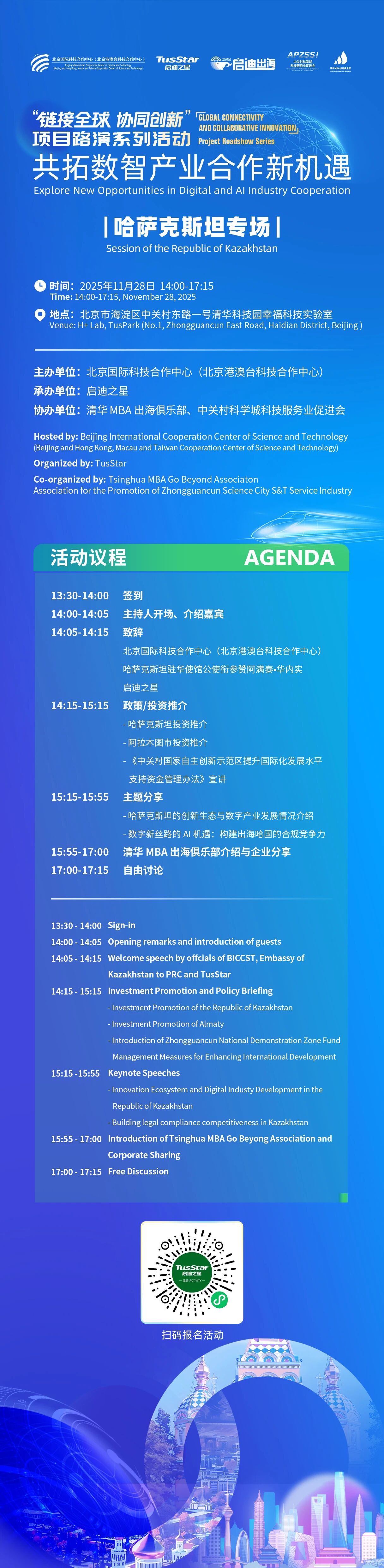 “链接全球 协同创新”项目路演系列活动——哈萨克斯坦专场将于11月28日在清华科技园幸福科技实验室举办。本次活动将邀请来自哈萨克斯坦驻华使馆、阿拉木图市投资局、哈萨克斯坦顶尖孵化器的专家,深度解析哈萨克斯坦的产业现状、市场潜力、投资环境与合作机遇等。活动现场还将特邀中兴通讯等知名出海企业到场分享,展示处于不同出海阶段的中企如何在中亚市场开局。