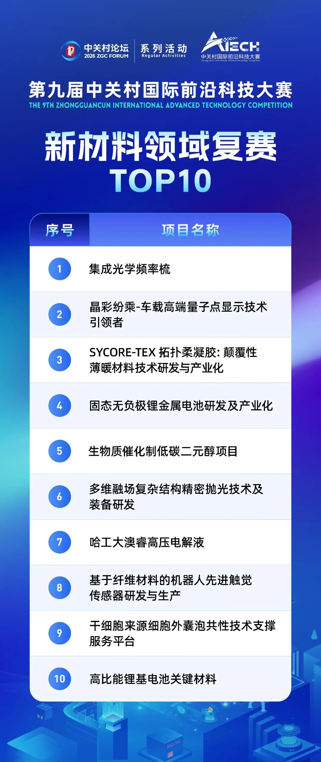 2月5日至6日,2026中关村论坛系列活动——第九届中关村国际前沿科技大赛新材料领域复赛在中关村新兴产业前沿技术研究院举办。经过现场路演和专家评审,集成光学频率梳、晶彩纷乘-车载高端量子点显示技术引领者等10个创新项目脱颖而出,入围该领域TOP10。