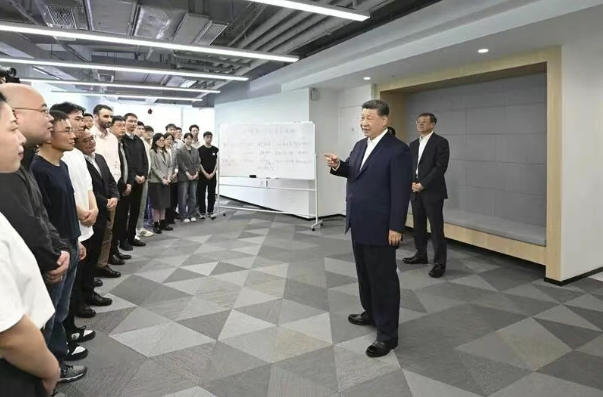 2025年4月29日,习近平总书记在上海“模速空间”大模型创新生态社区,同正在参加“下一代智能体的自主进化”主题沙龙的青年创新人才亲切交流。
