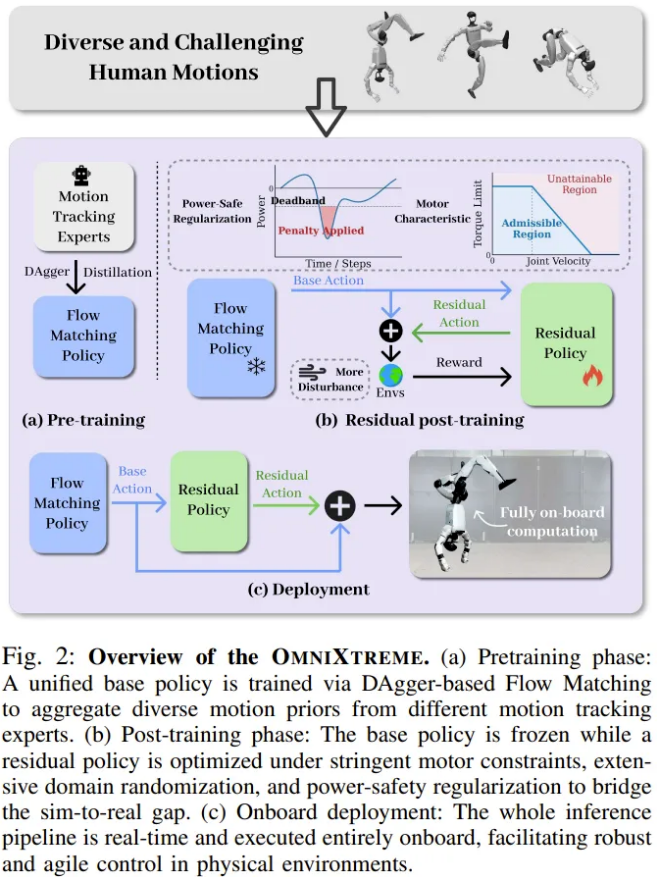 为了从根本上解决这一问题,研究团队提出了 OmniXtreme 框架。该框架将动作技能的学习与物理驱动的微调进行了巧妙的解耦,分为「基于流的可扩展预训练」与「驱动感知的残差后训练」两个核心阶段。