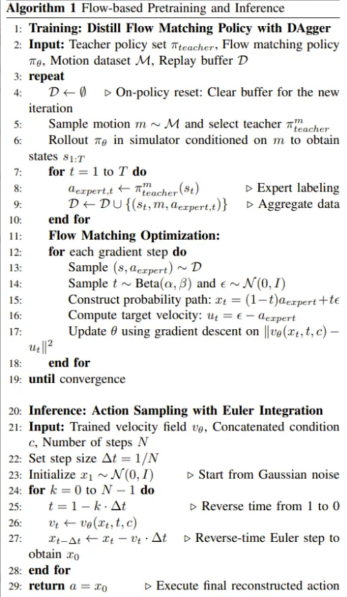在上述公式中,a_t 表示在流时间步 t 下,专家动作 a_{expert} 与随机噪声 ε 之间的插值动作。该目标函数使得模型能够学习到一个速度场 v_θ,从而在推理时通过正向欧拉积分生成高精度的连续控制动作。为了保证物理稳定性,团队在这一阶段仅引入了适度的噪声和域随机化,确保策略能够准确捕捉底层的物理动力学特征。