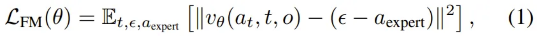 在数学表达上,基于流的模型通过优化以下目标函数来学习从纯噪声中恢复专家动作的过程 :