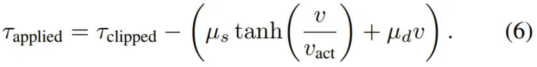 单纯的扭矩截断往往会忽略由反电动势引起的与速度相关的物理限制。团队将真实的电机运行包络线直接集成到了仿真器中,定义了随关节速度幅值单调递减的容许扭矩函数。此外,系统还通过非线性摩擦项对执行器级别的内部损耗进行了建模 :