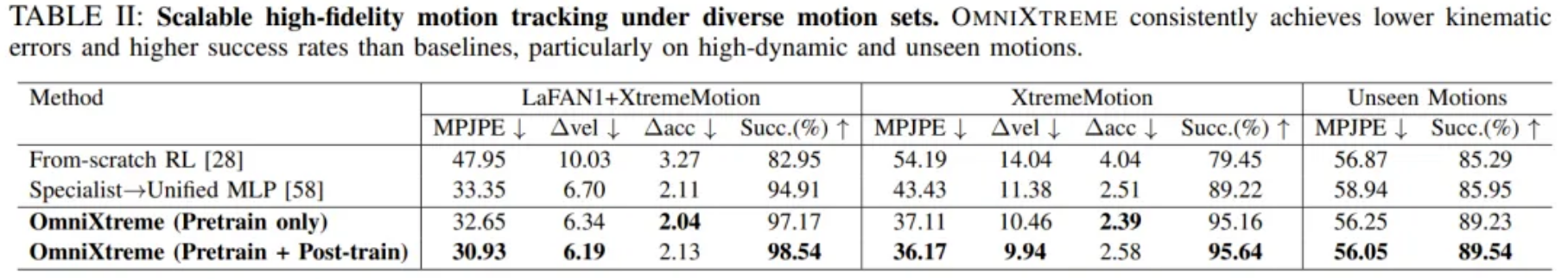 为了全面评估 OmniXtreme 的可扩展性与鲁棒性,研究团队不仅使用了标准的 LAFAN1 动作库,还精心挑选了约 60 个极具挑战性的动作,构建了 XtremeMotion 评估集。这些动作包含了极高的角速度、频繁的接触切换以及严苛的时序约束。