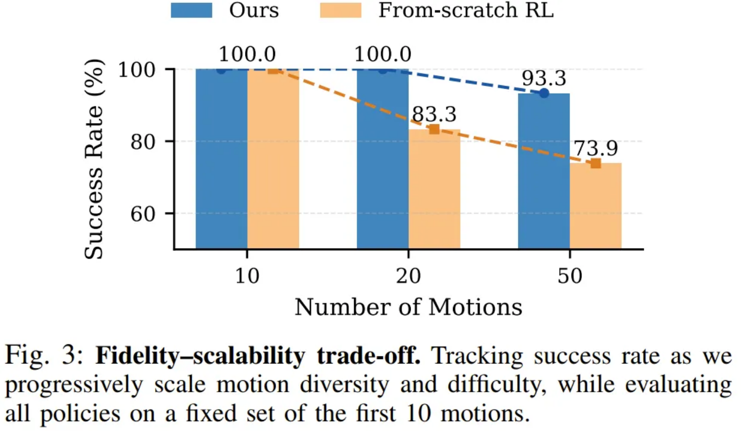 实验结果揭示了显著的差异。随着动作多样性的增加,传统从头训练的强化学习基线模型出现了严重的性能衰退,其成功率从 100% 暴跌至 83.3%,最终滑落至 73.9%。