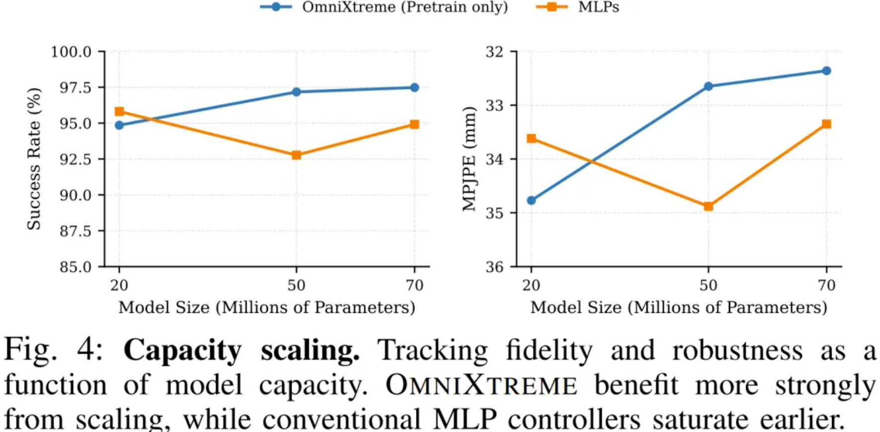 图表数据清晰地显示,传统的 MLP 策略在扩大参数量后很快就陷入了性能饱和,跟踪精度提升极其有限。