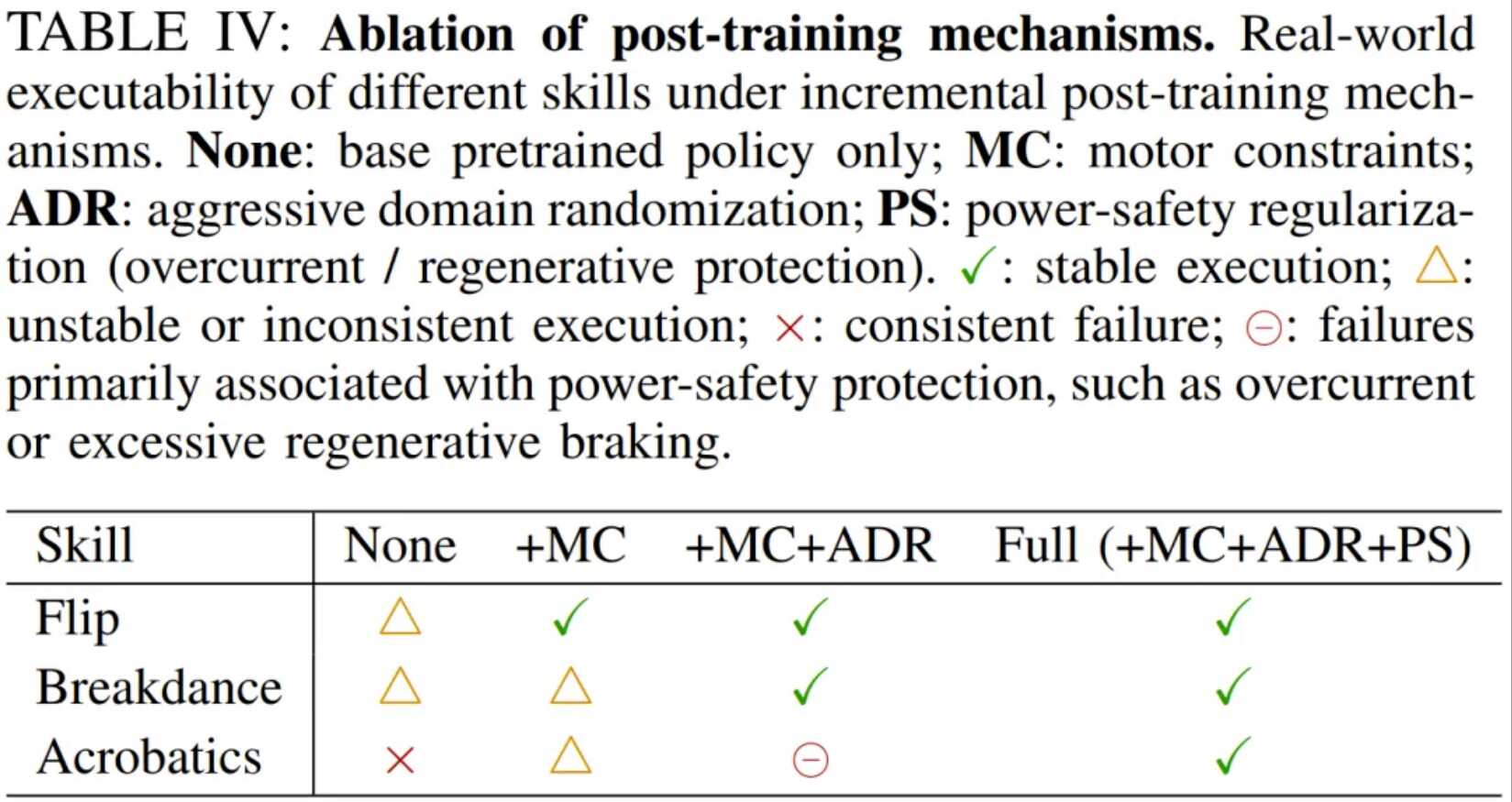 对于具有强爆发力的翻腾动作(如后空翻),仅仅引入电机约束就足以保障稳定执行,因为这避免了底层硬件极限的瞬间崩溃。然而,对于包含高频接触转换的霹雳舞动作,系统必须同时依赖电机约束与激进的域随机化,才能在接触扰动中维持时序敏感的平衡。