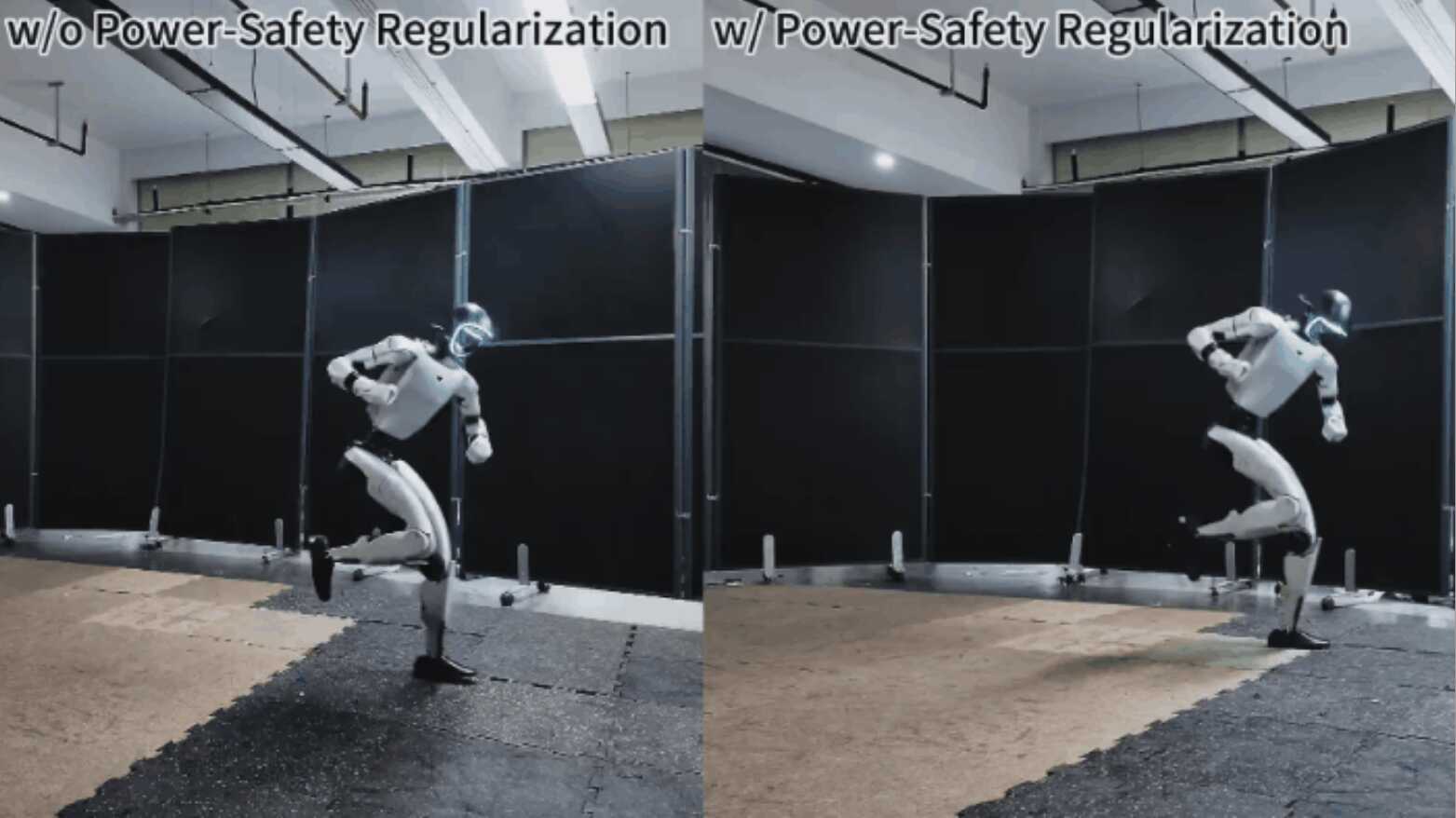 最严苛的挑战来自于包含高速冲击缓冲的杂技落地动作。团队发现,如果没有功率安全正则化机制,即使模型在姿态上维持了平衡,也会因为电机瞬态制动导致过流或电池欠压而宣告失败。