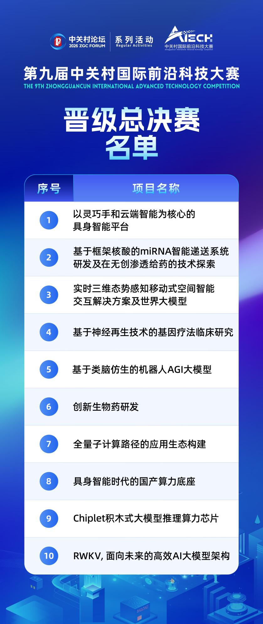 3月11日至12日,2026中关村论坛系列活动——第九届中关村国际前沿科技大赛半决赛在中关村国际技术交易中心举办。经过现场路演和专家评审,以灵巧手和云端智能为核心的具身智能平台、基于框架核酸的miRNA智能递送系统研发及在无创渗透给药的技术探索等10个创新项目脱颖而出,锁定总决赛席位。