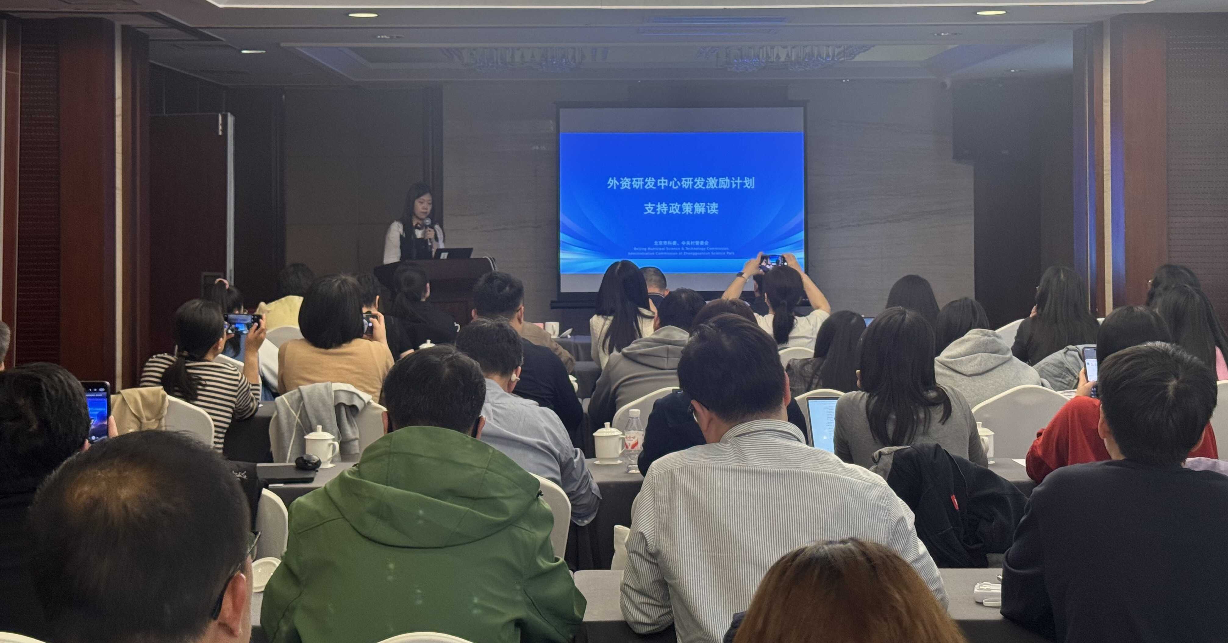 4月23日,北京市科委、中关村管委会会同市公安局出入境管理局、北京中关村综合保税区、人民银行北京市分行召开外资研发中心政策宣讲会,为赛诺菲、康明斯等60余家外资研发中心的70余名代表解读政策。