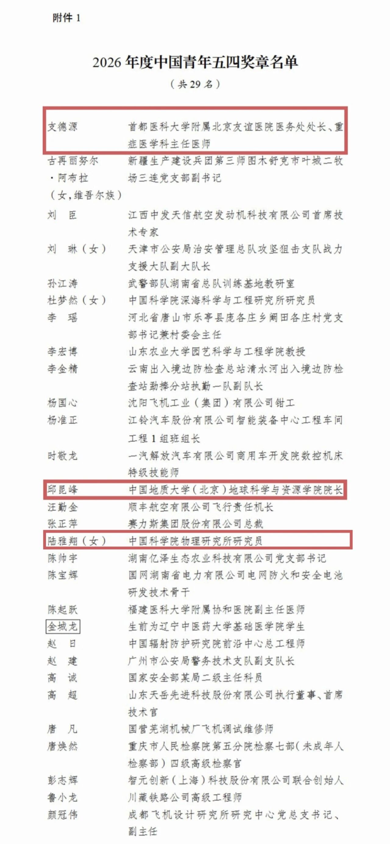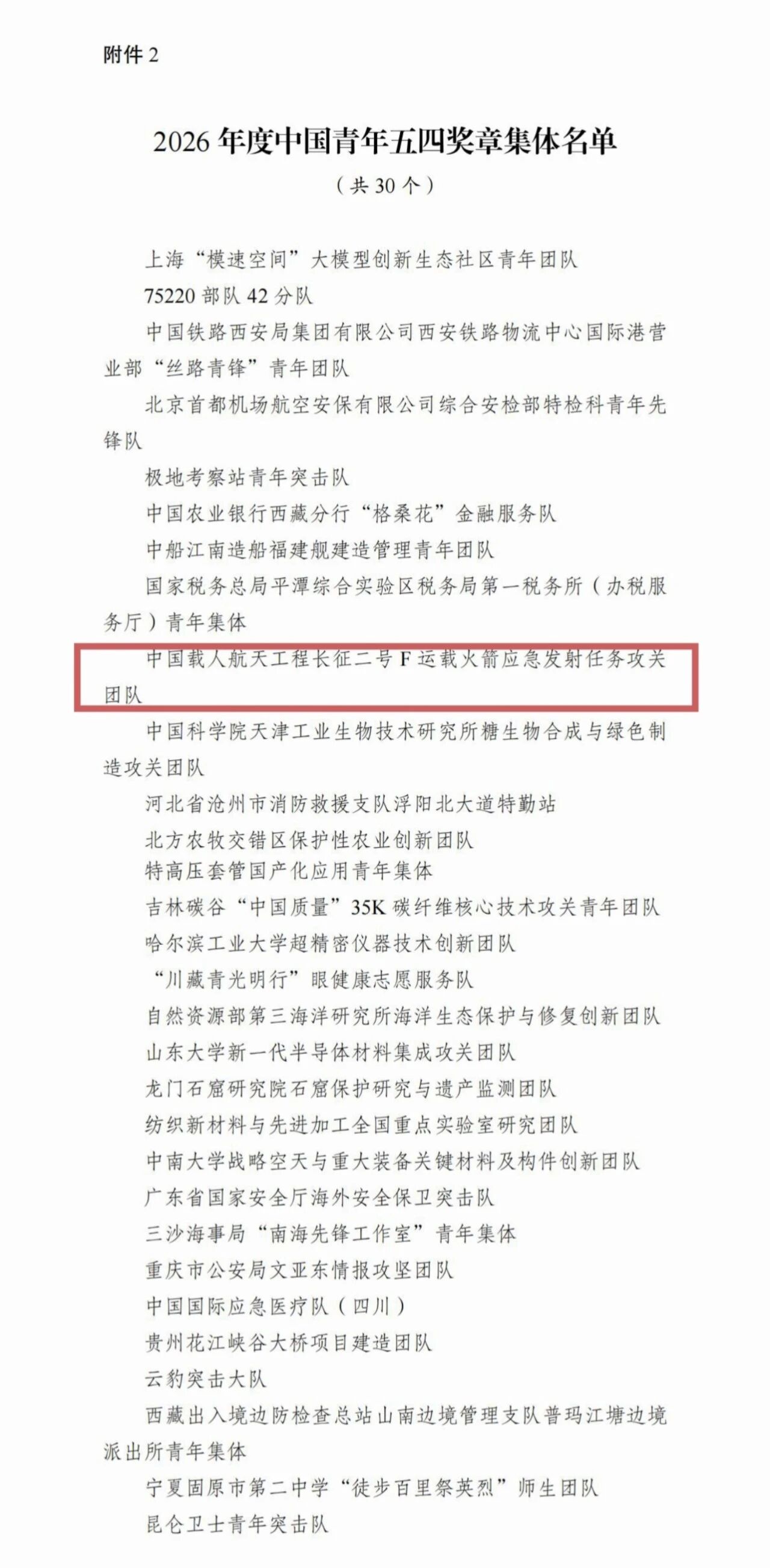 4月27日,2026年度中国青年五四奖章暨新时代青年先锋奖评选结果揭晓。北京多名科研青年和科研团队获得表彰。其中,支德源、邱昆峰、陆雅翔被授予中国青年五四奖章,中国载人航天工程长征二号F运载火箭应急发射任务攻关团队荣获中国青年五四奖章集体。