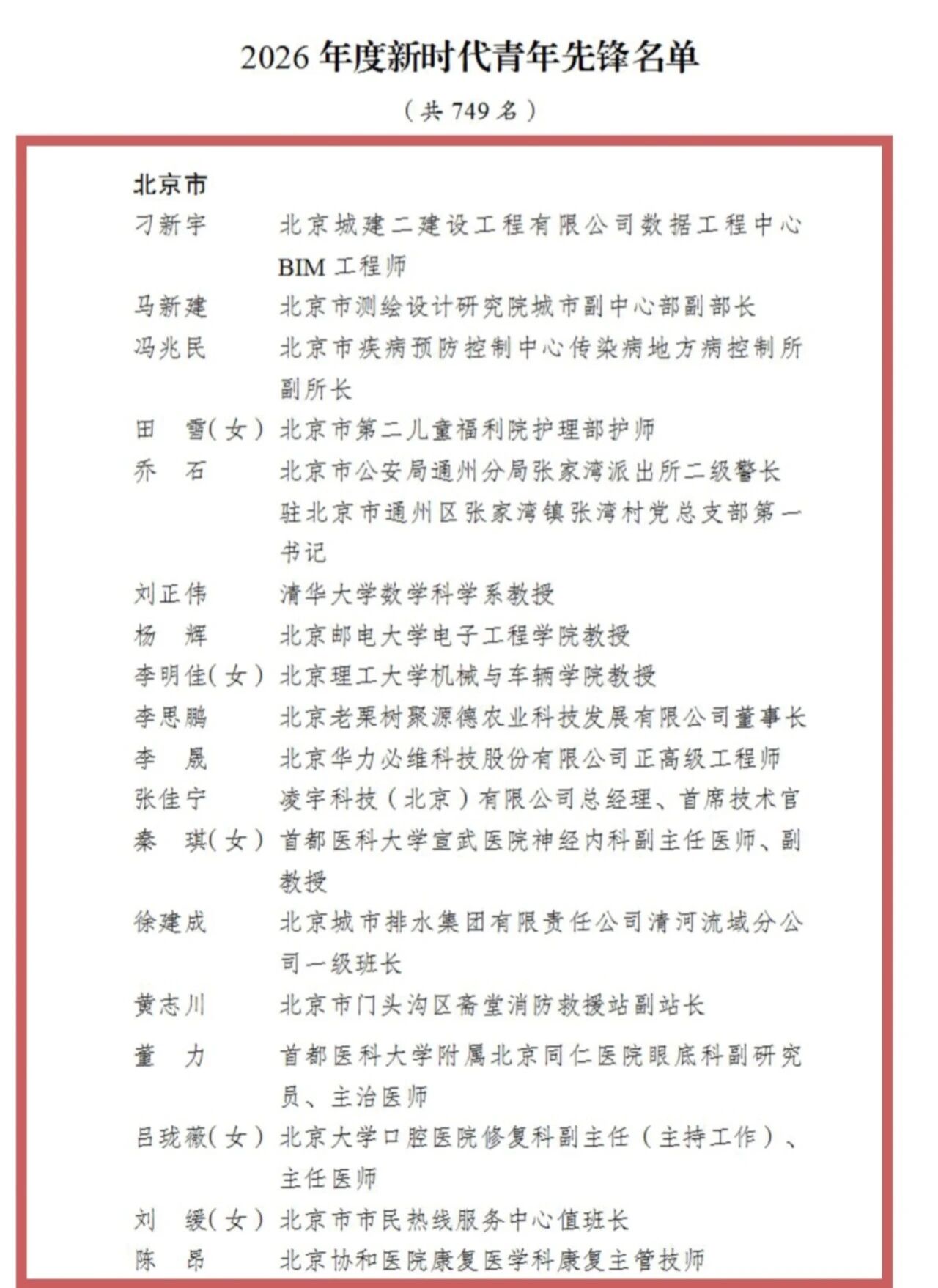 共青团中央、全国青联还授予749名同志新时代青年先锋。来自北京城建二建设工程有限公司数据工程中心的BIM工程师刁新宇等18名北京青年获此殊荣。