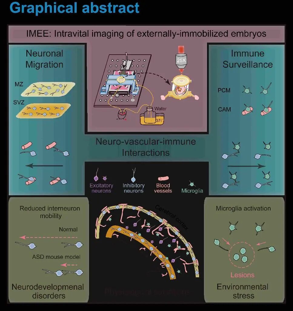 胎儿期是大脑发育的关键时期,但胚胎小鼠的神经细胞动态行为一直难以研究。12月16日,国际学术期刊《细胞》刊载了清华大学米达团队与郭增才团队合作完成的一项开创性研究。该研究通过开发一种高稳定性、多视角、长时程的胚胎小鼠宫内活体成像技术(IMEE),首次在体阐明了胚胎小鼠大脑皮层内抑制性神经元与血管网络及小胶质细胞间的动态互作模式。