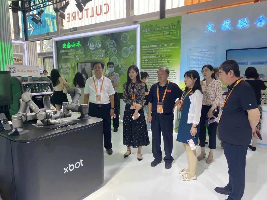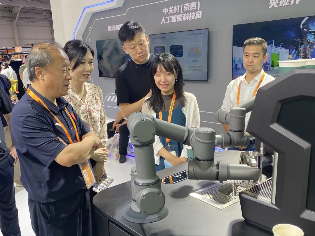 门头沟展区的园区参展企业及展品包括遨博的双臂拉花咖啡机器人、聚力维度的AI数字人直播系统、至格科技的衍射光波导AR智能眼镜、夏禾科技的发光器件、元点科技的时空穿梭4D动感轨道影院等。李世春书记一行调研展区,详细了解参展企业及产品在服贸会期间的展览展示情况。