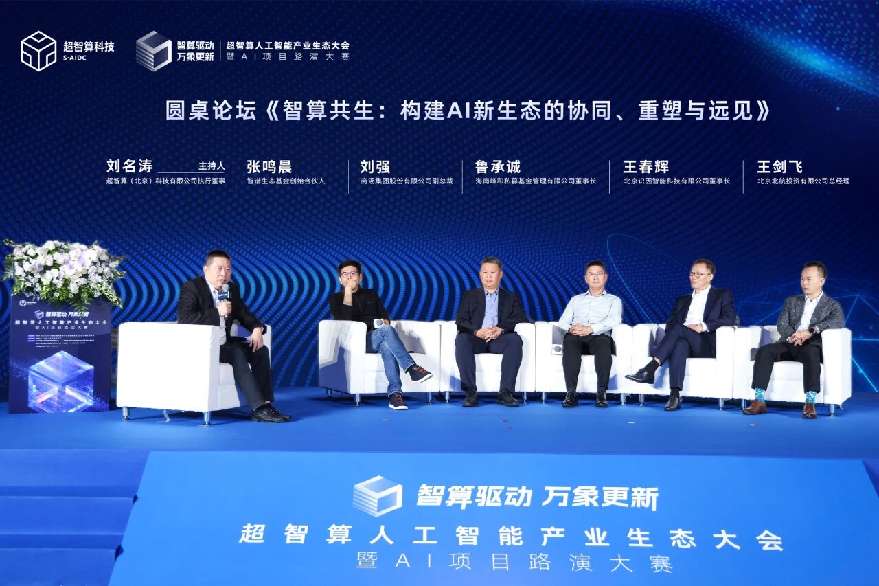 圆桌论坛环节,超智算科技执行董事刘名涛主持开展了以《智算共生:构建AI新生态的协同、重塑与远见》的讨论,与北京北航投资有限公司总经理王剑飞、商汤集团股份有限公司副总裁刘强、峰和资本董事长鲁承诚、智谱生态基金创始合伙人张鸣晨、北京识因智能科技有限公司董事长王春辉围绕“算力如何驱动产业创新”、“AI技术商业化路径”及“生态构建的关键要素”等核心议题展开深度对话,观点交锋。