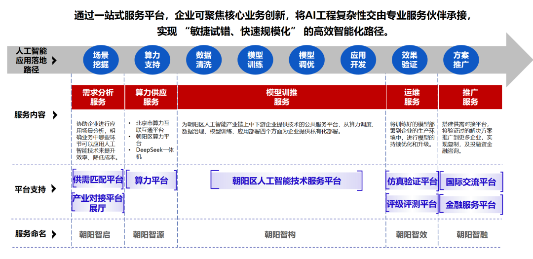 为帮助中小企业和创新团队解决“找不到、不会用、用不起”的资源困境,打通政策、算力、数据、金融等关键资源之间的链路,中关村智用人工智能研究院推出朝阳区人工智能一站式服务中心,提供集政策咨询、供需对接、算力调度、数据赋能、金融支持、人才服务于一体的线上线下融合平台。