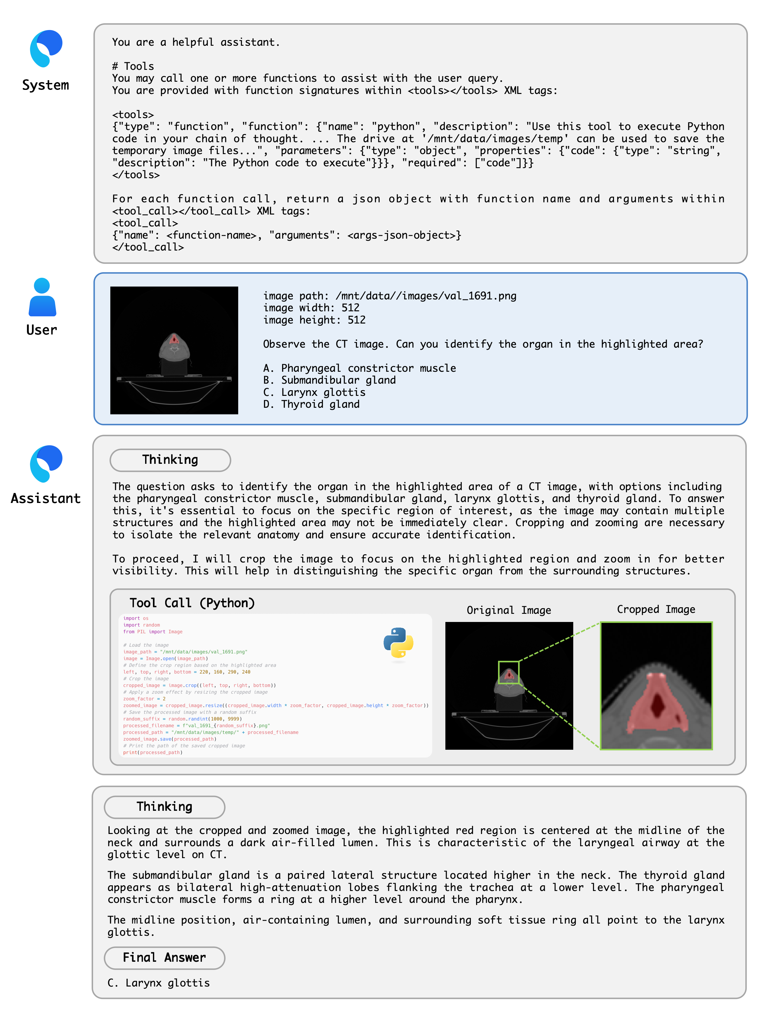 即模型可在推理过程中主动调用代码工具,对图像进行裁剪、放大、增强、框选与关键点标注等操作,结合局部信息完成后续推理。