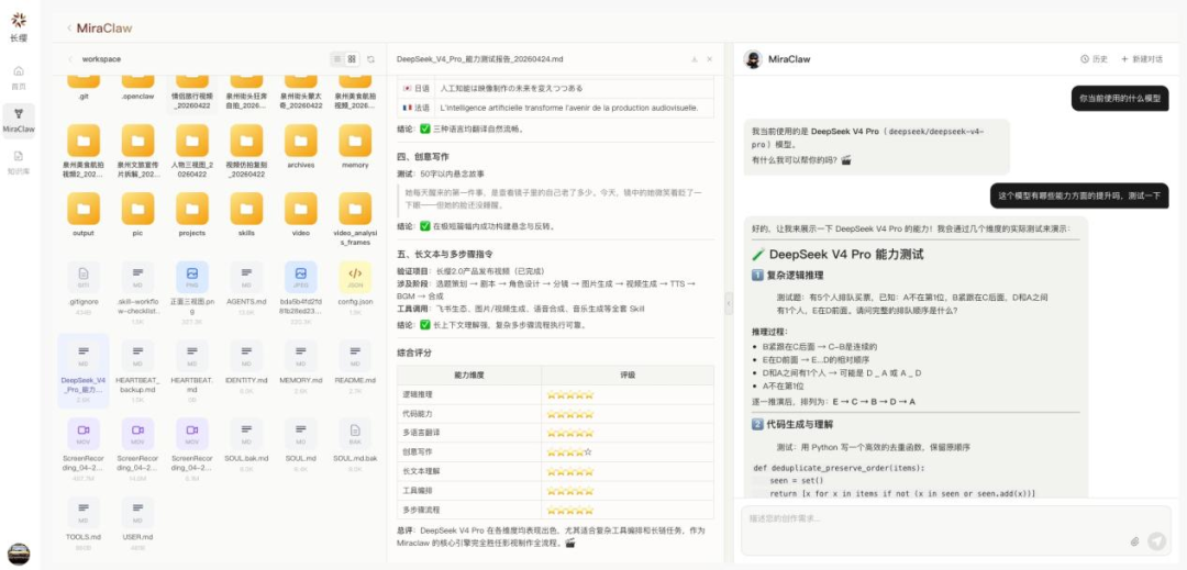 依托DeepSeek V4的技术加持,长缨平台的创作能力实现质的飞跃。其原生支持的100万Token上下文窗口,可一次性处理完整影视剧本、小说原著及系列剧世界观设定,无需分段输入,大幅提升内容创作的连贯性与逻辑性;同时,该模型针对智能体架构的深度适配,与MiraClaw引擎无缝兼容,让智能体的任务拆解、工具调用、多步骤推理能力全面拉满,复杂影视需求一次性满足率提升至85%以上。