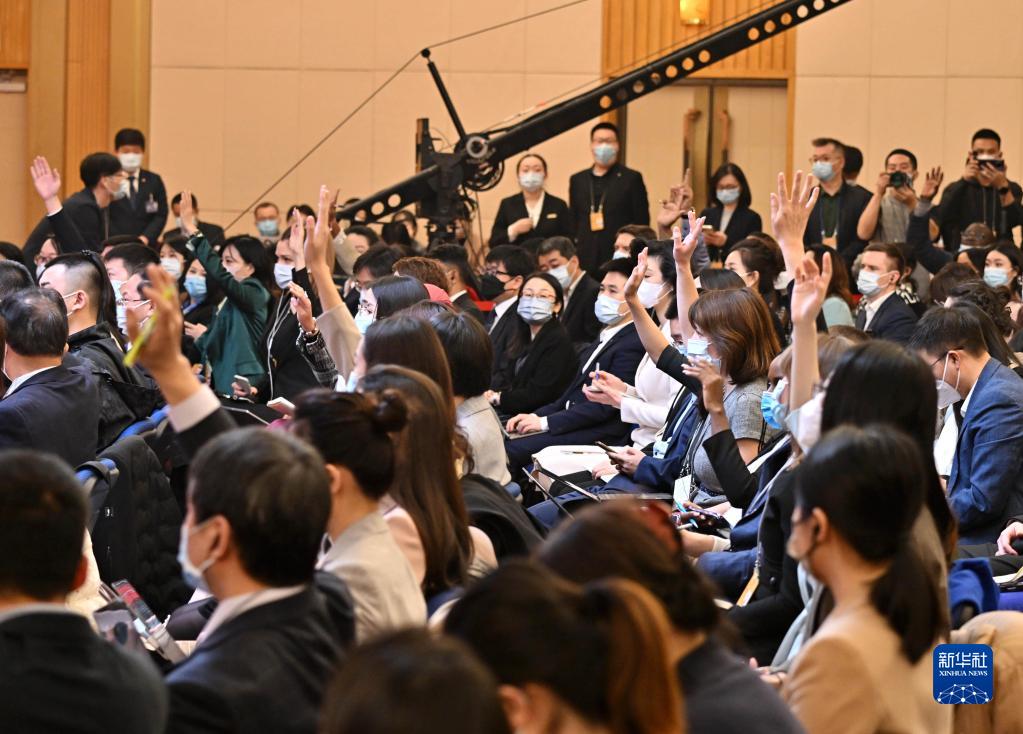 3月7日,十四届全国人大一次会议在北京梅地亚中心多功能厅举行记者会,外交部长秦刚就“中国外交政策和对外关系”相关问题回答中外记者提问。这是记者在现场举手提问。新华社记者 李鑫 摄
