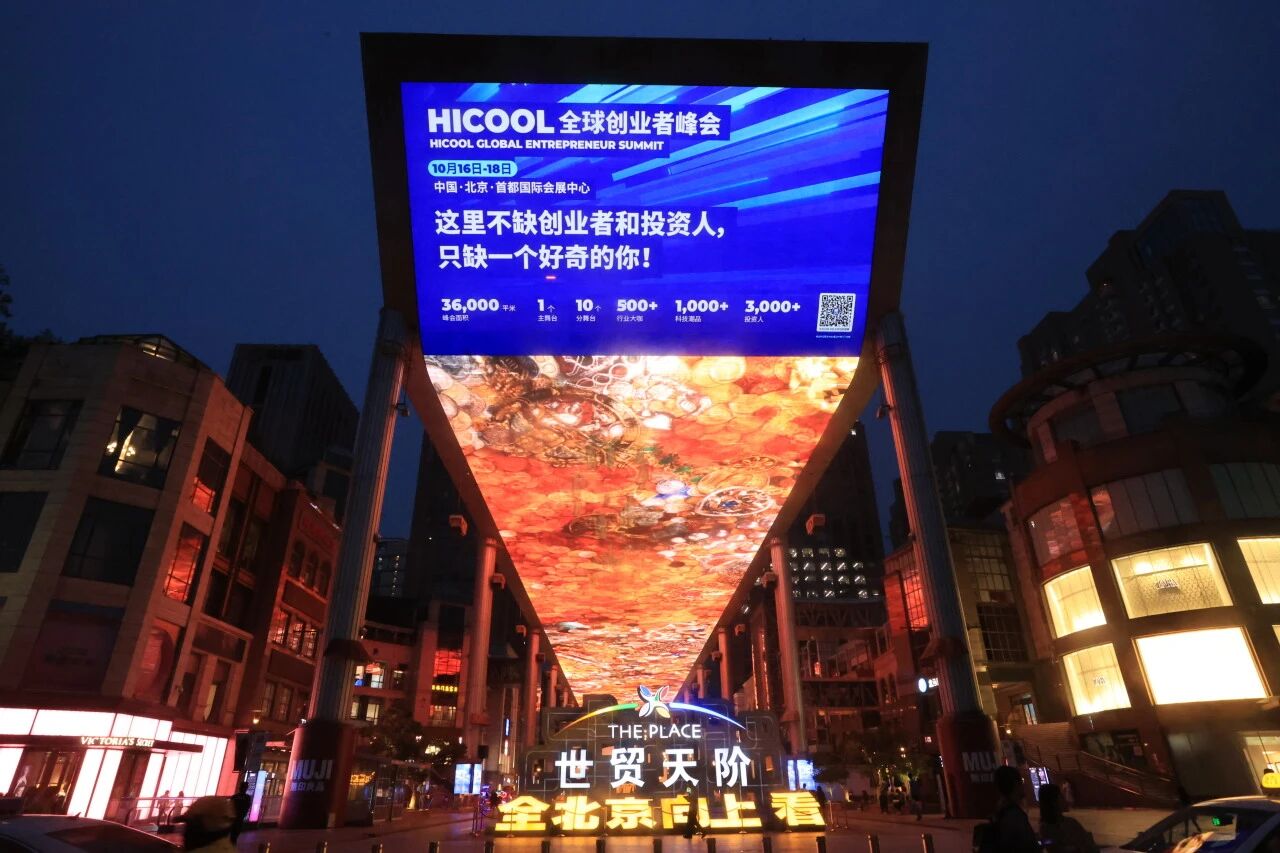 HICOOL2025全球创业者峰会城市大屏亮相世贸天阶。